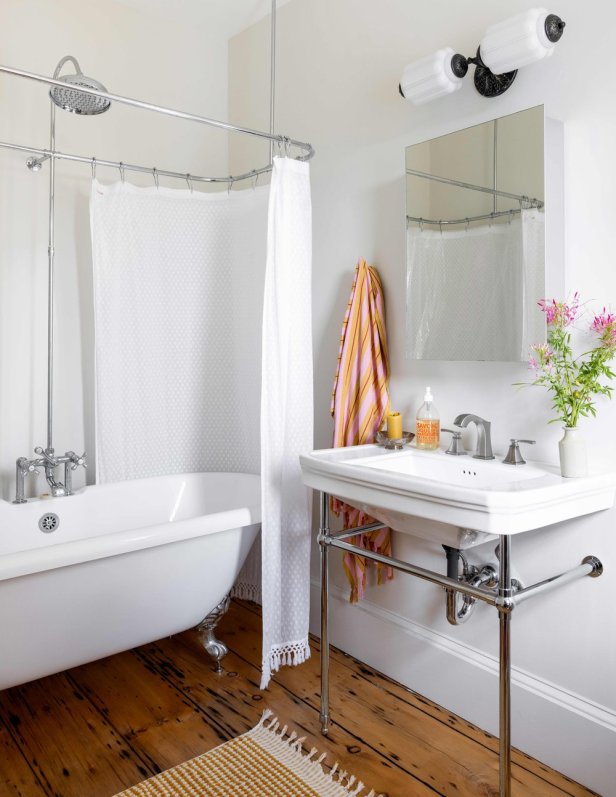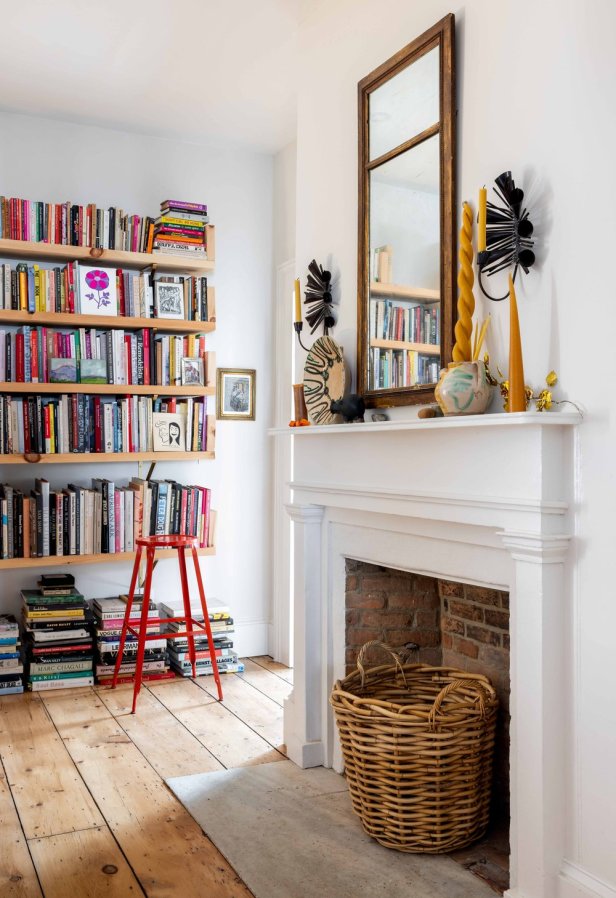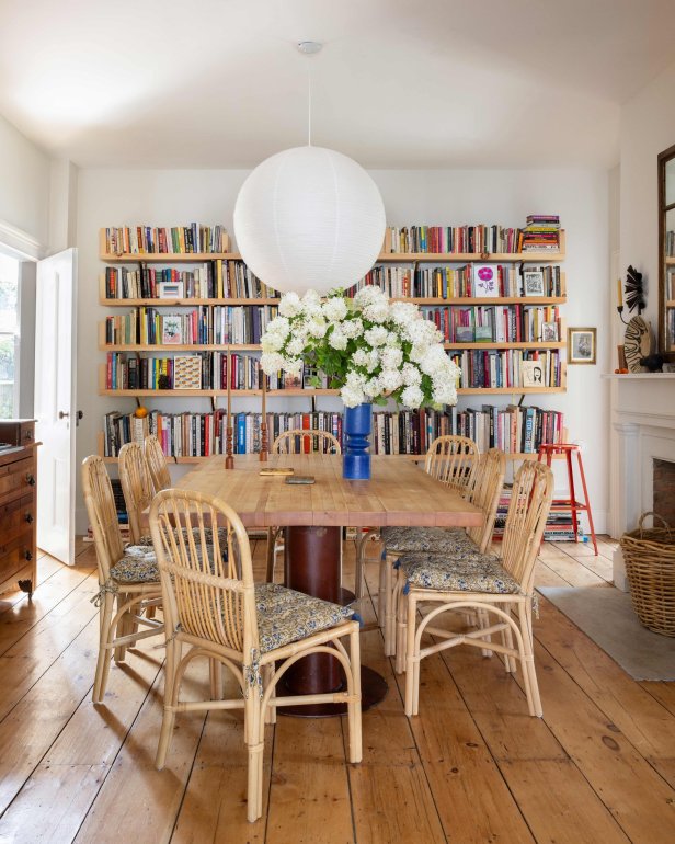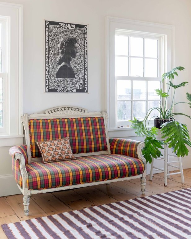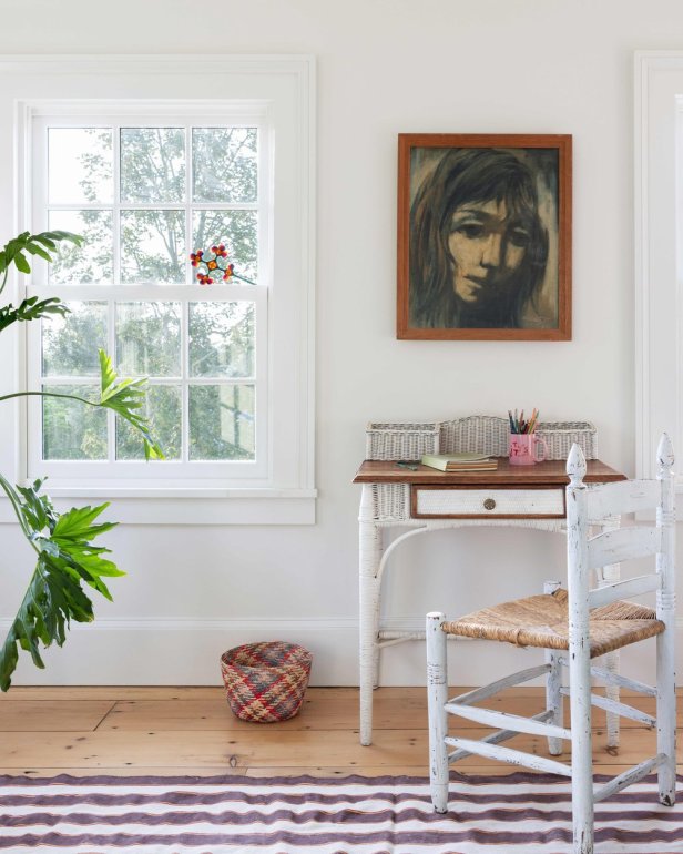 Cette maison mettant en valeur des éléments familiers : de superbes expositions des collections organisées qui parviennent toujours à se sentir à la fois habilement stylisées et souvent utilisées, ainsi que des murs d’un blanc éclatant et des moments audacieux de couleurs et de motifs. Mais les planchers de bois à larges planches mielleuses, les moulures de fenêtre ornées et les cheminées avec des manteaux de style Shaker offrent une sensation plus bucolique unique à la région du nord de l’État de New York
