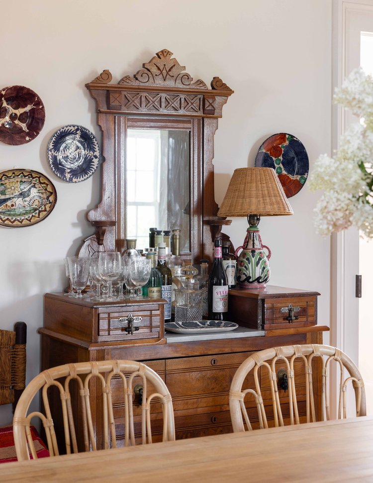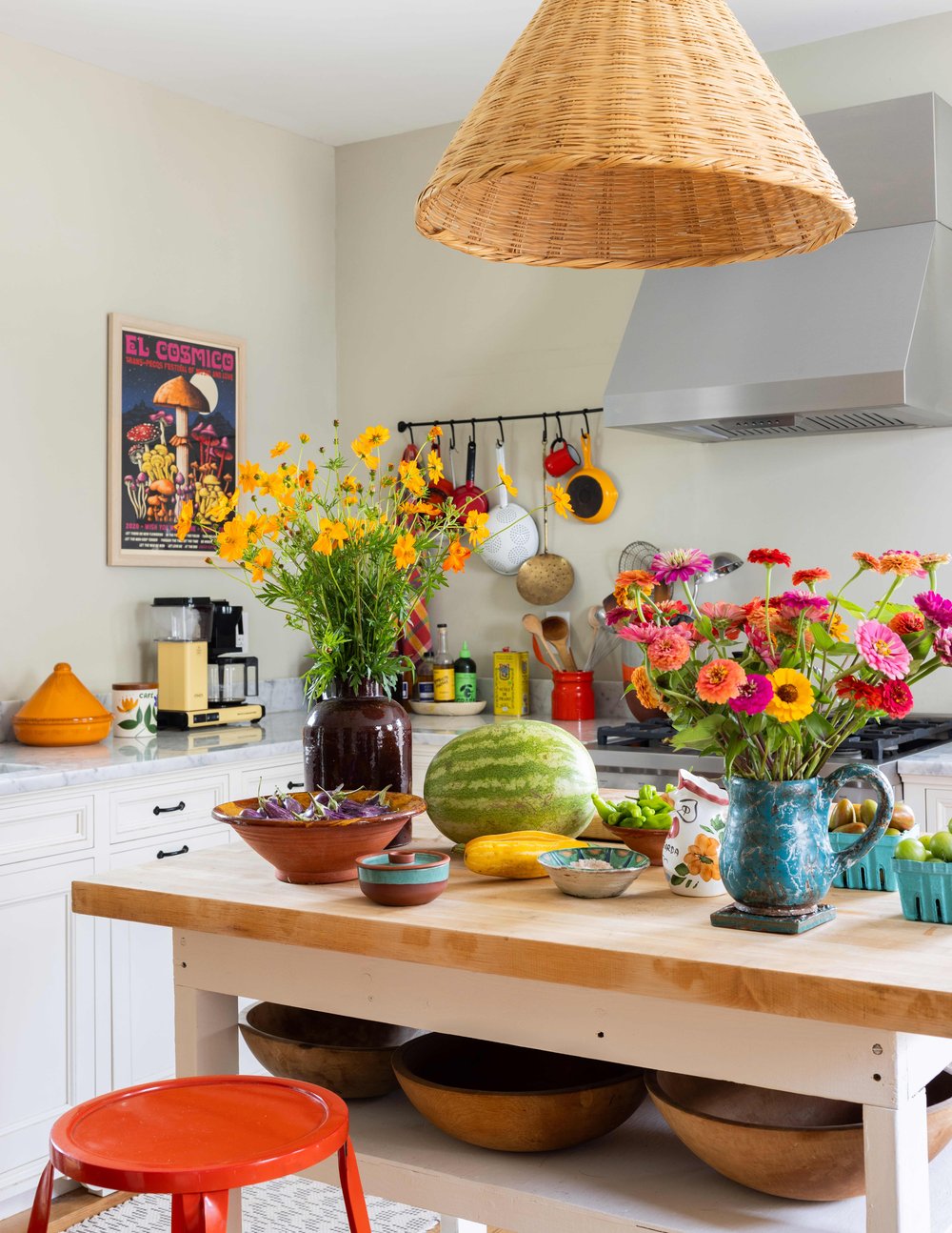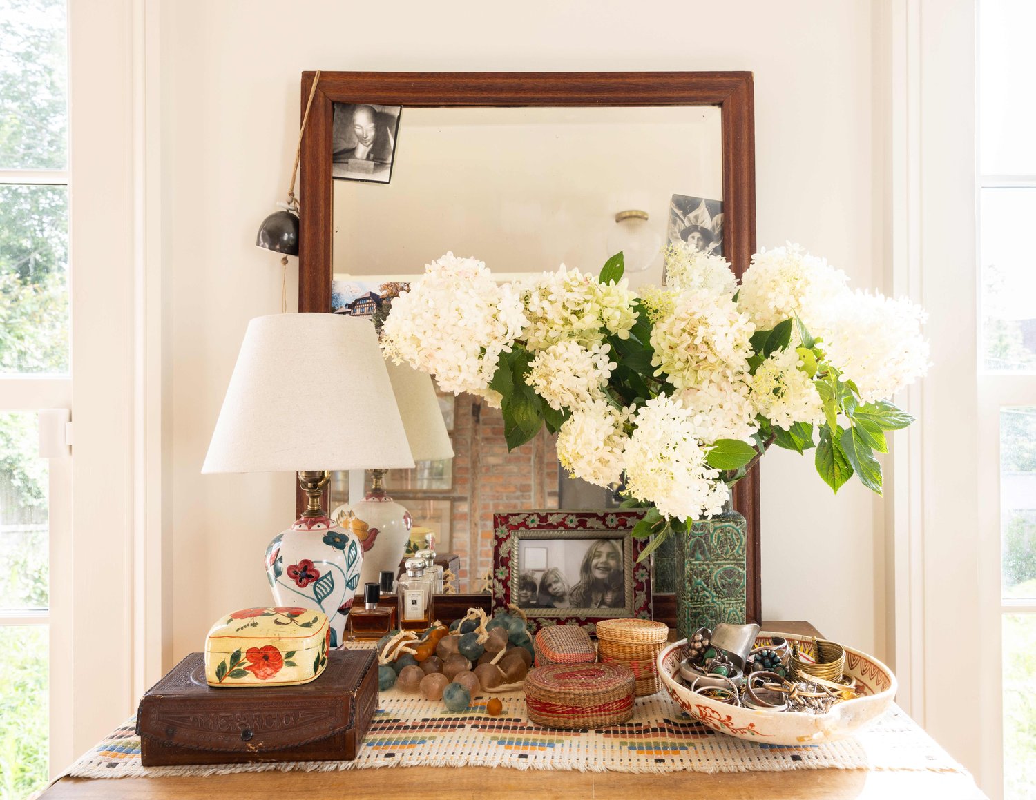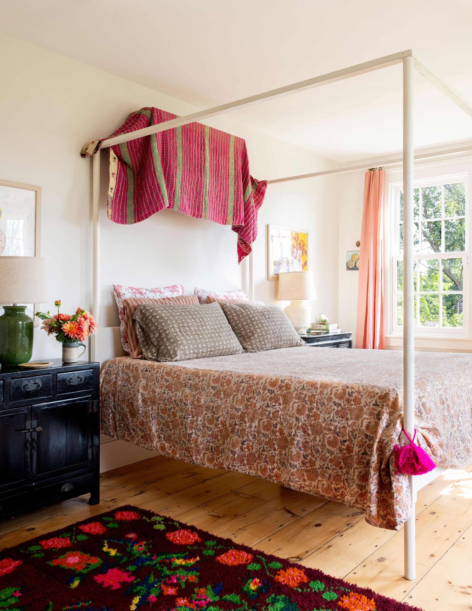 Cette maison mettant en valeur des éléments familiers : de superbes expositions des collections organisées qui parviennent toujours à se sentir à la fois habilement stylisées et souvent utilisées, ainsi que des murs d’un blanc éclatant et des moments audacieux de couleurs et de motifs. Mais les planchers de bois à larges planches mielleuses, les moulures de fenêtre ornées et les cheminées avec des manteaux de style Shaker offrent une sensation plus bucolique unique à la région du nord de l’État de New York