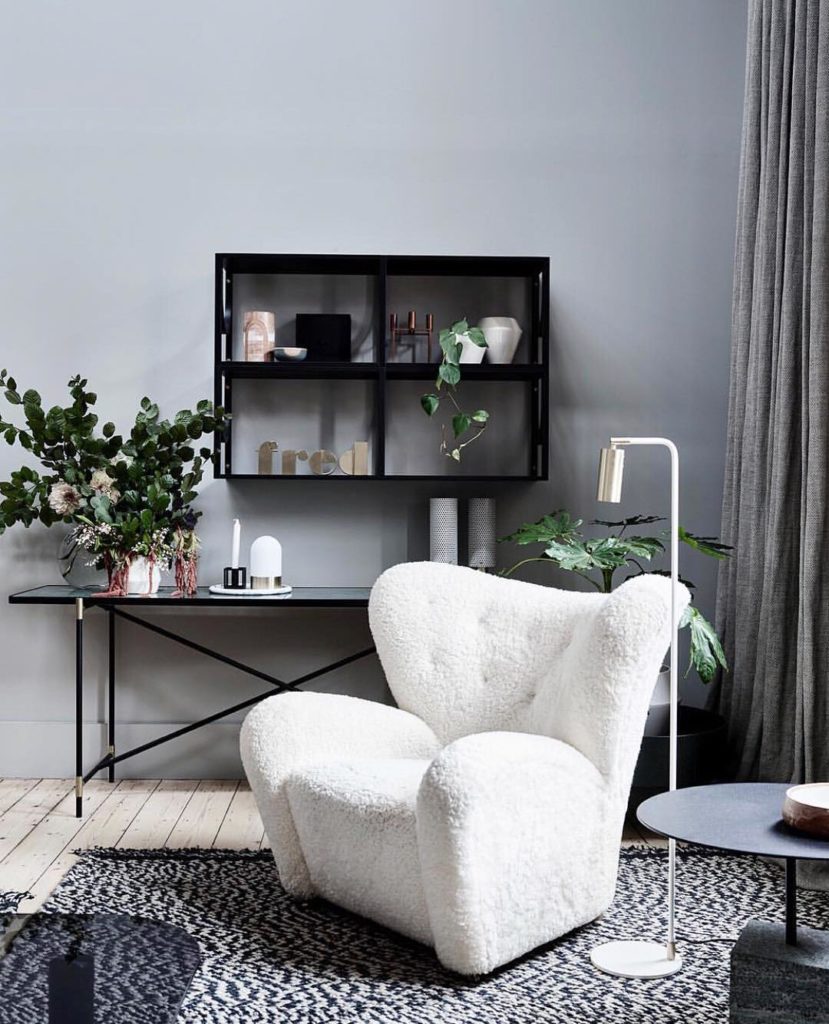 Relancé en 2015, ce design primé est proposé avec un revêtement moelleux, y compris de la peau de mouton en clin d’œil à l’original, et avec des pieds en bois de cœur de chêne naturel ou huilé foncé et des roulettes avant en laiton pour un déplacement facile. Un repose-pieds correspondant assure un confort supplémentaire. Beaucoup de gens trouvent simplement des fauteuils cool de style milieu du siècle et les retapissent simplement dans la peau de mouton laineuse. J’adore la texture que le look ajoute à une pièce. Dans une maison avec des planchers de bois franc et des murs blancs austères, je pense qu’un fauteuil floue serait le moyen idéal d’adoucir une pièce.