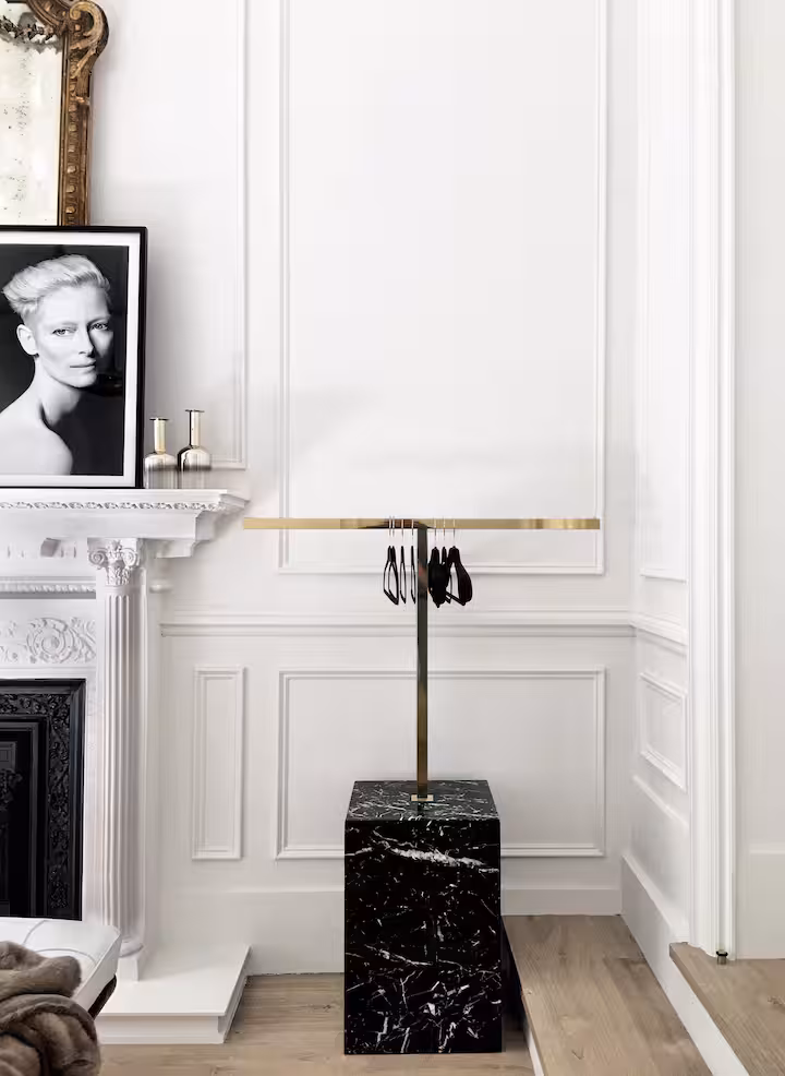 Ce studio a été conçu comme une suite hôtelière, pied-à-terre luxueux pour passer quelques jours en ville, sans avoir à descendre dans un hôtel et pour vivre en toute indépendance. Sa beauté originelle, redécouverte après une rénovation, nécessitait l’emploi de matériaux haut-de-gamme pour le mobilier et la décoration. Le marbre et le cuir ainsi que les textiles naturels viennent s’accorder aux murs blancs, et apporter un style design à cet écrin ancien et classique.
