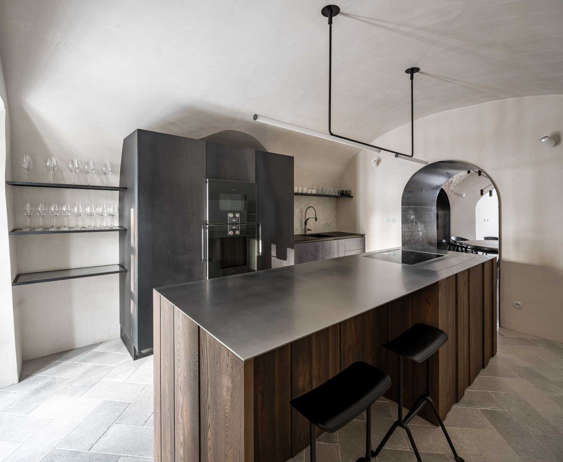 Le mur de pierre d’origine était très humide, de sorte que les concepteurs ont suivi le chemin de l’humidité, coupant le plâtre, exposant les murs et les voûtes pour que les structures puissent respirer. Seule la partie inférieure des murs d’enceinte est pourvue de plâtre .