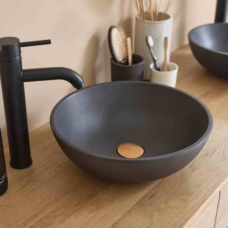 Cette jolie vasque grise en béton à la forme bol pourra être disposée sur votre meuble sous vasque dans votre pièce d’eau.