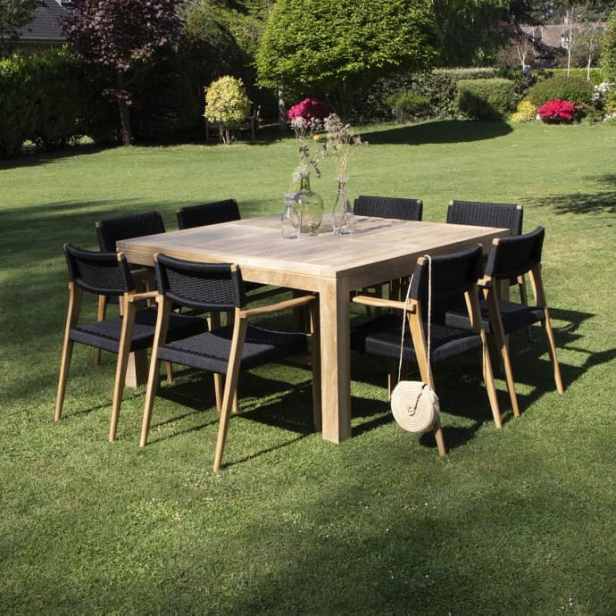 Ce salon de jardin en bois est composé d’une table de jardin en teck massif 8 personnes ainsi que 8 fauteuil en teck massif et cordage noir. Réalisé en bois de teck massif, ce salon de jardin vous assure durabilité et résistance face aux intempéries. Ce salon de jardin aux allures contemporaines séduit par son bois brut authentique. Il respire la modernité et la beauté grâce à la couleur noir du cordage. Ajoutez une touche d’exotisme à votre extérieur avec cet ensemble réalisé avec des matériaux éco-responsables. chez Gerah Betah