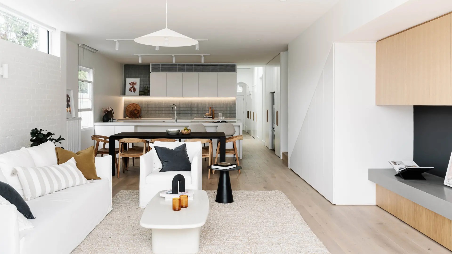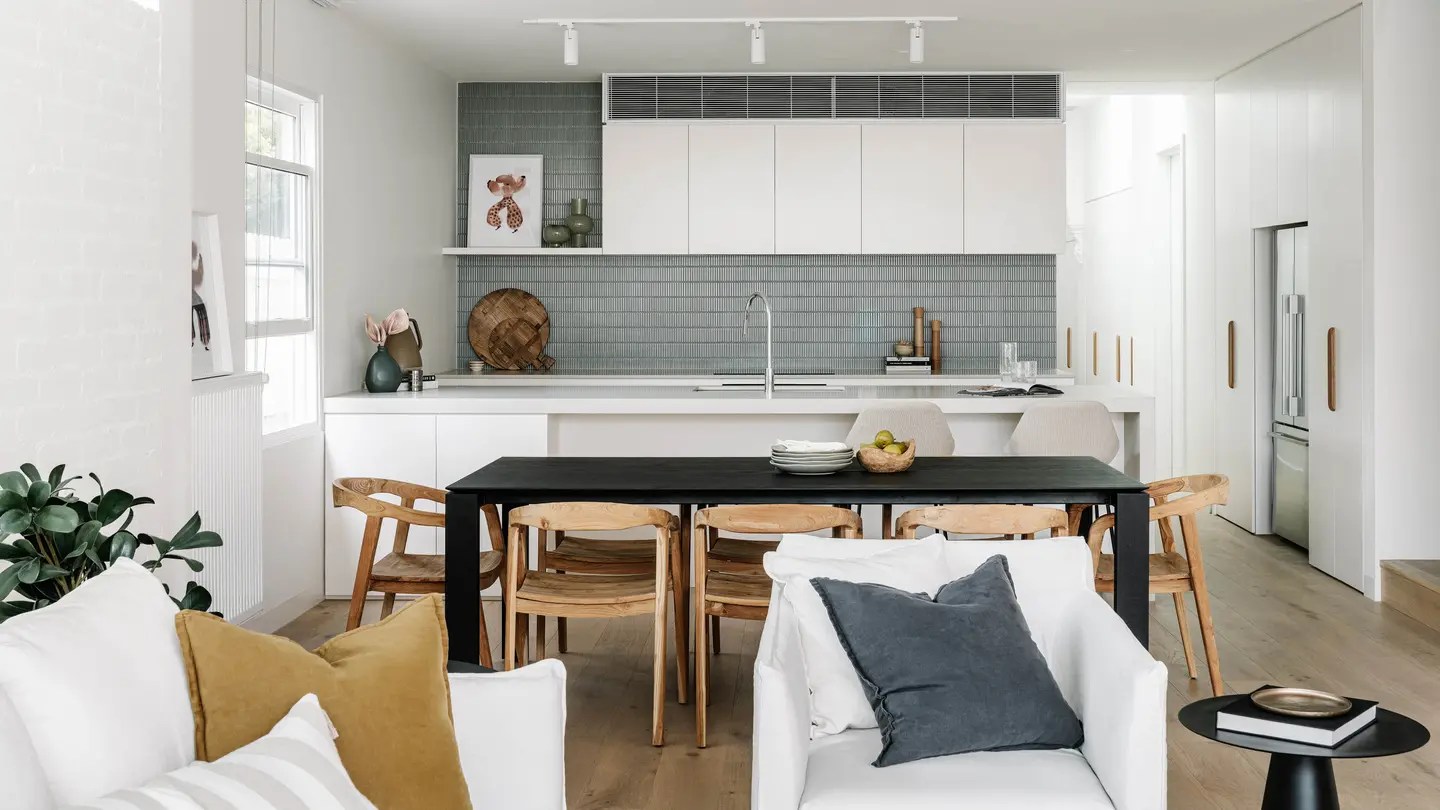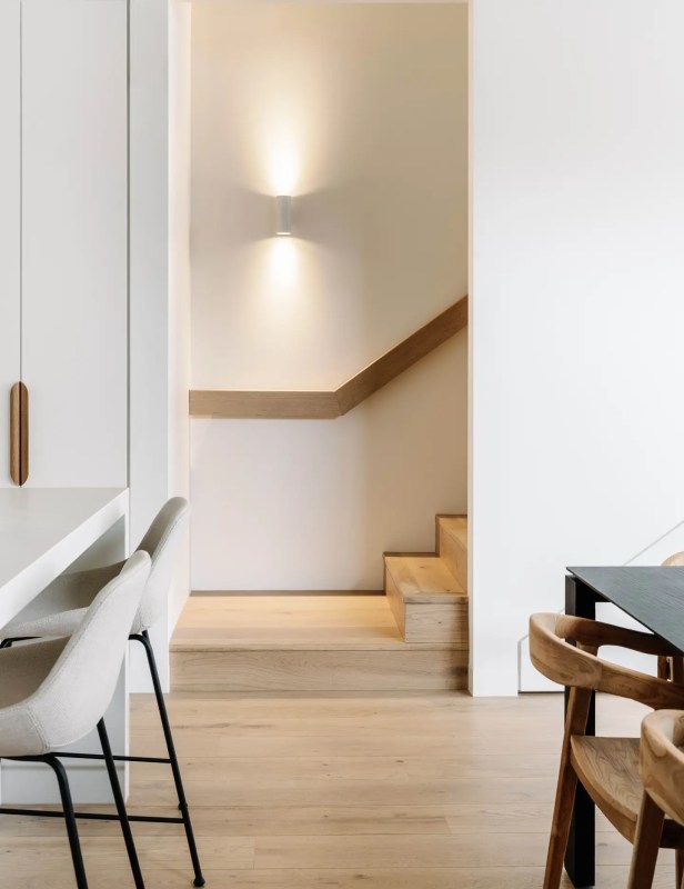 Les intérieurs sont épurés et intemporels, composés de bois légers et de murs blancs qui insufflent à la maison un sentiment de calme.