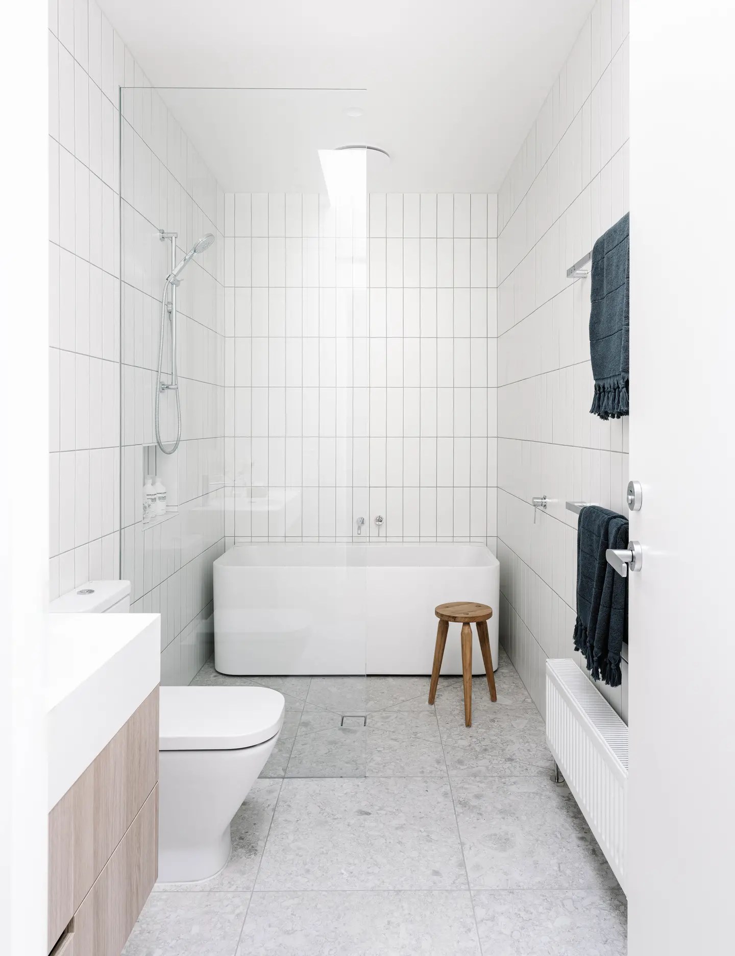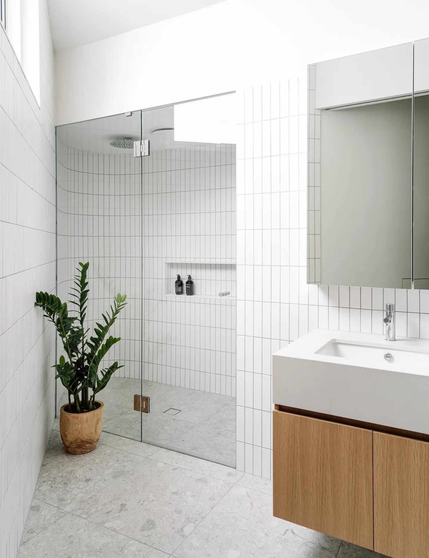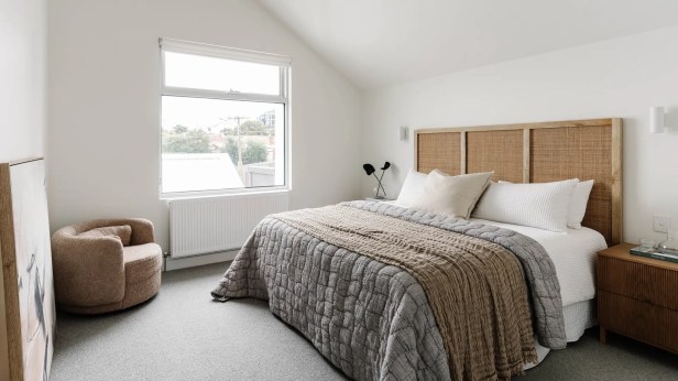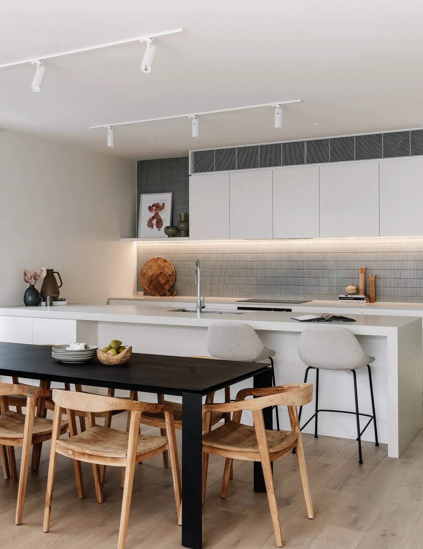 Les intérieurs sont épurés et intemporels, composés de bois légers et de murs blancs qui insufflent à la maison un sentiment de calme.