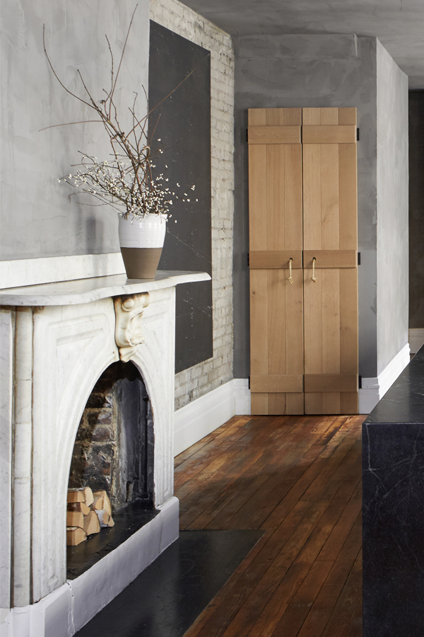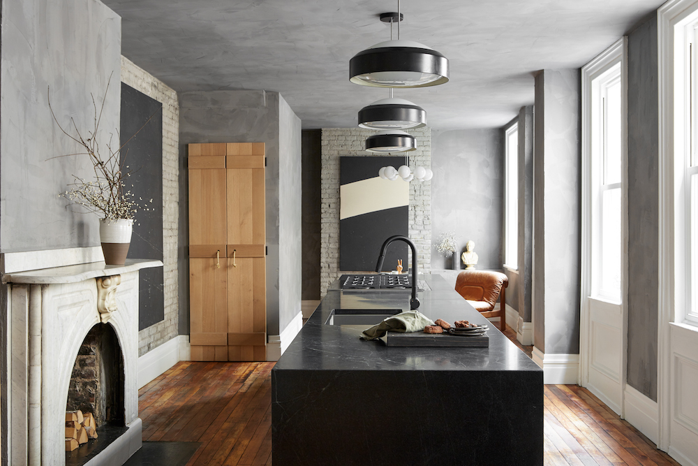 La chose que j’aime vraiment dans cette cuisine, c’est cet îlot épique. Revêtu de pierre ollaire en cascade, il abrite tous les éléments essentiels de la cuisine – l’évier, la cuisinière et le four sont tous bien rangés là-dedans avec beaucoup d’espace de comptoir à revendre. Des pendentifs vintage avec des accents noirs attirent le regard vers le haut. Conçue par , Leanne Ford, cette cuisine toute grise réside dans une maison du 19ème siècle à Pittsburg, mais elle adopte une approche totalement nouvelle du concept de cuisine