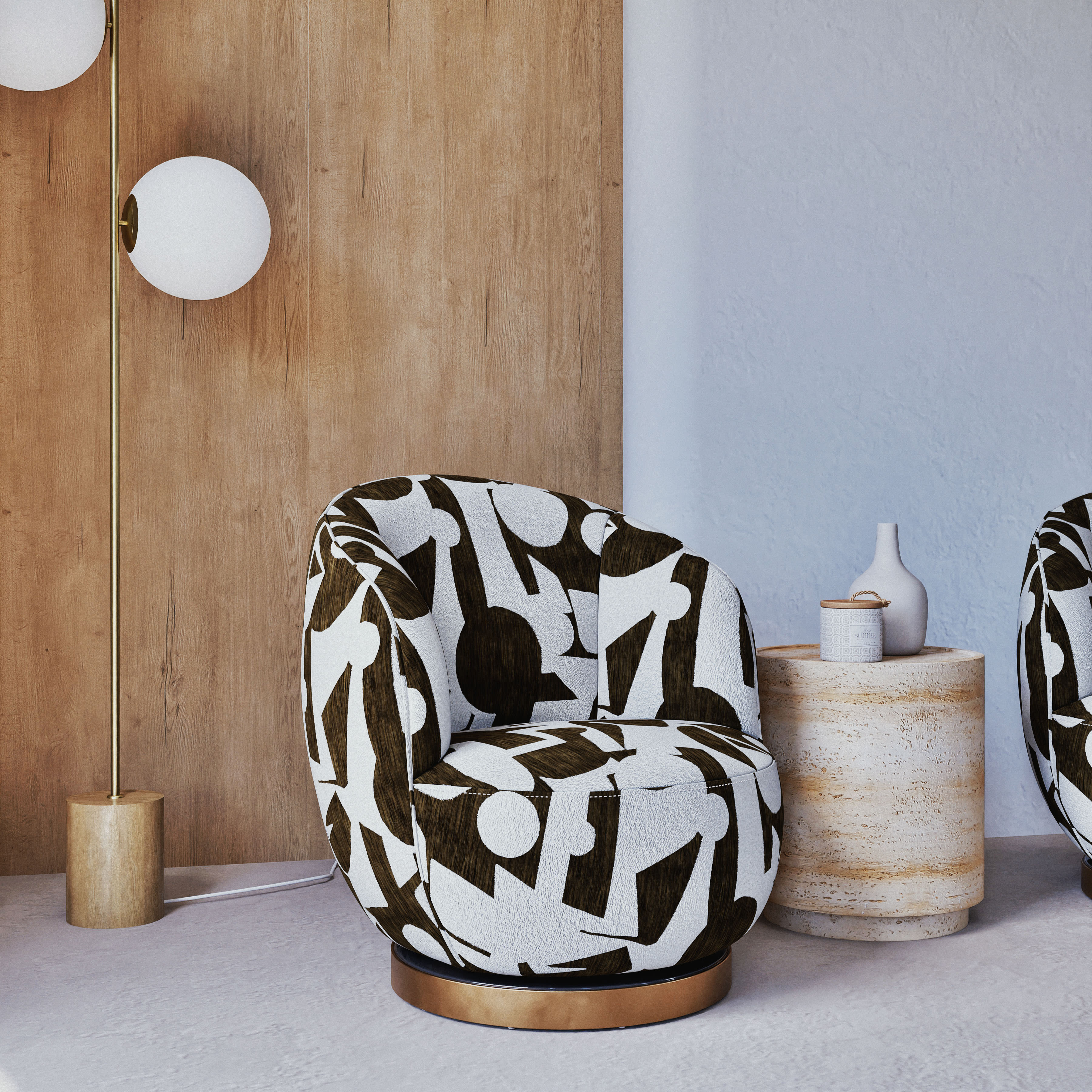 - Des motifs géométriques et graphiques au mur, au sol et jusque dans le design des abats-jours et des chaises.