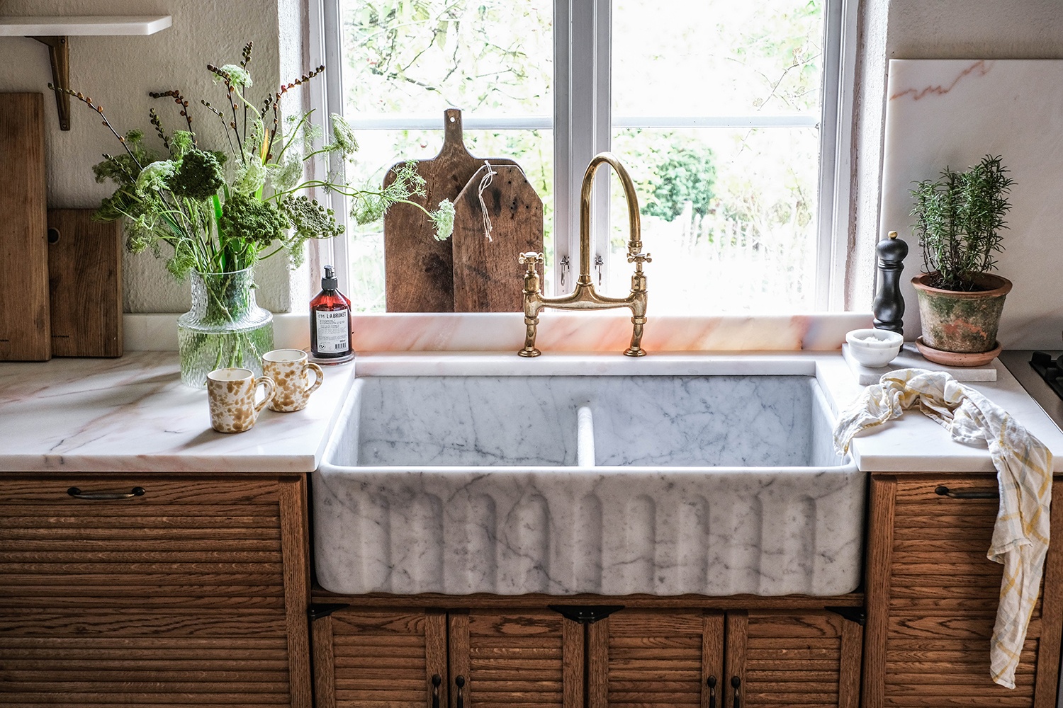 nous aimons le fait qu’elle ressemble presque à un meuble et qu’elle ait cette ambiance super confortable. Il s’inspire des intérieurs anglais du milieu du siècle et les placards sont en chêne. Vous pouvez même choisir différentes couleurs si vous préférez un bois plus clair ou un bois peint. Une autre caractéristique que nous aimons est la possibilité d’avoir des portes ou des tiroirs en verre et des façades fermées. Le mélange des deux rend la cuisine si unique et intéressante pour nous. C’est super agréable que vous puissiez présenter certains de vos articles préférés dans les tiroirs en verre, comme la céramique ou le linge préférés, puis avoir les autres articles plus fonctionnels derrière des portes 🙂 closes .visite guidée inspirez vous