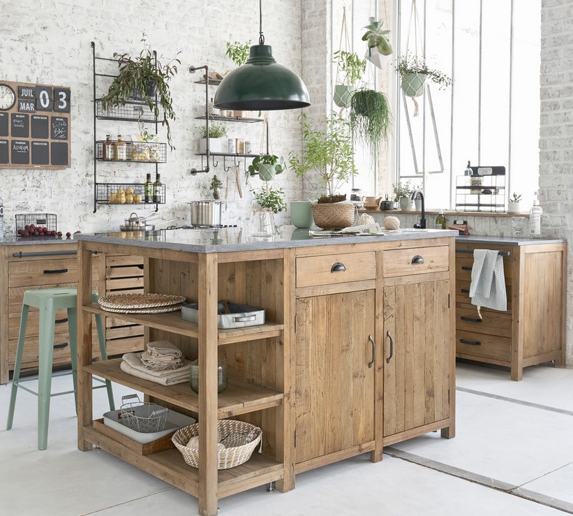 Le salon est installé dans une sorte de véranda, un lieu lumineux et reposant. On mise ici sur les matières naturelles que sont le bois clair, le rotin, le lin ou le coton créent une atmosphère douce et réconfortante. C’est une décoration pour la belle saison qui se réinventera en hiver en changeant les coloris naturels ou pastel, par des tons plus chauds comme l’ocre ou le terracotta. Dans la cuisine on retrouve l’essentiel et la simplicité du bois associé à la couleur verte. Elle dégage une allure très naturelle. Les teintes claires renforcent l’effet apaisant de la pièce. Peut-on dire que lorsque Maisons du Monde aménage un salon et une cuisine en style campagne chic, c’est une réussite? Je crois que l’on peut répondre oui à cette question. Pour retrouver tous les éléments présents dans ces pièces, direction le site de l’enseigne en cliquant sur ce lien !