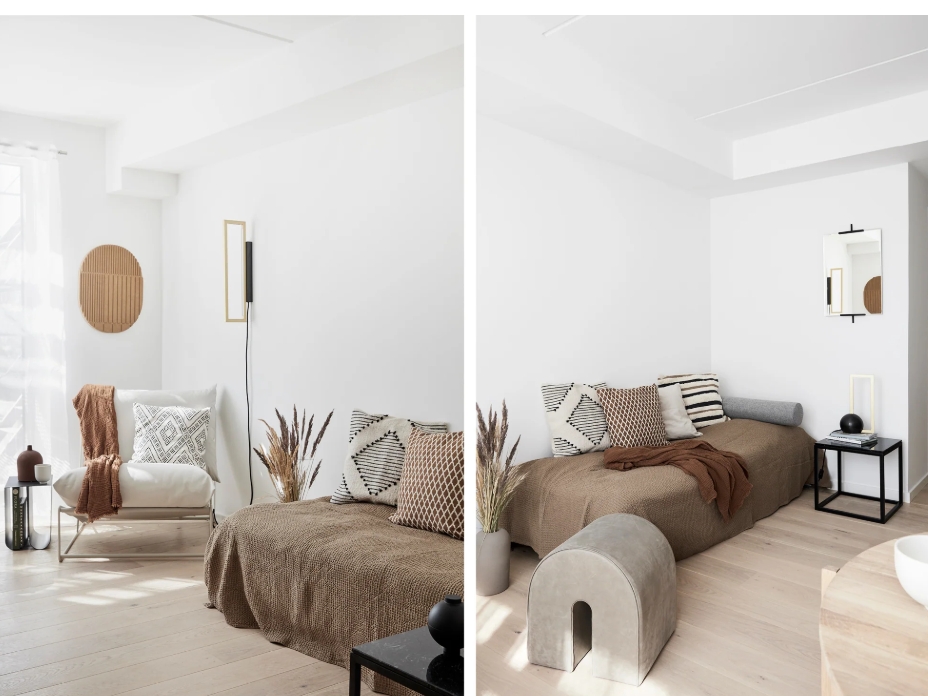 - Tapis distincts : Utilisez un tapis pour le coin salon (motifs géométriques) et un autre pour le coin nuit (teintes douces) pour marquer les zones.