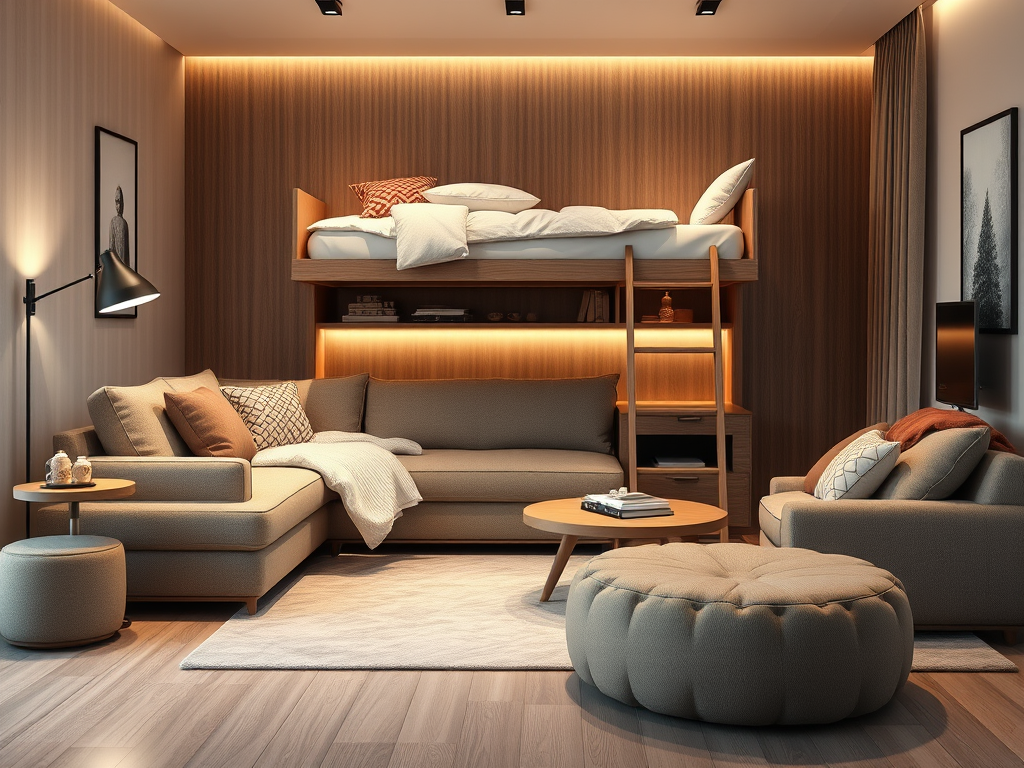 - Lit mezzanine ou escamotable : Un lit mezzanine libère l’espace au sol pour un salon complet. Un lit escamotable (qui se replie dans un meuble) est idéal pour les petits espaces.