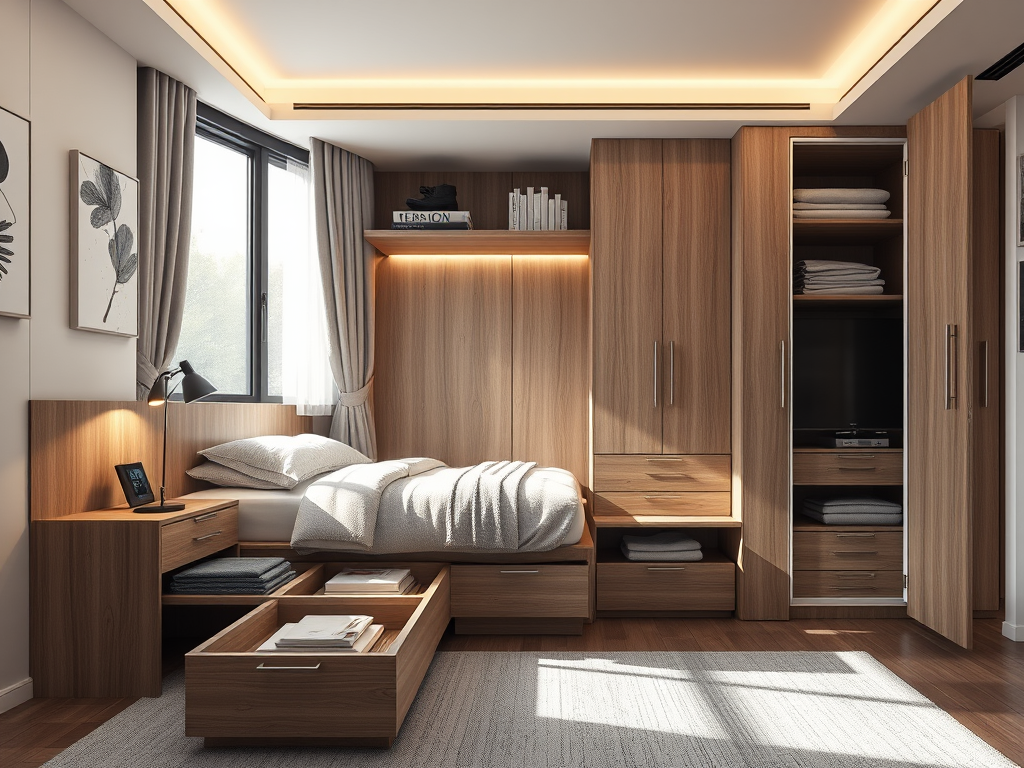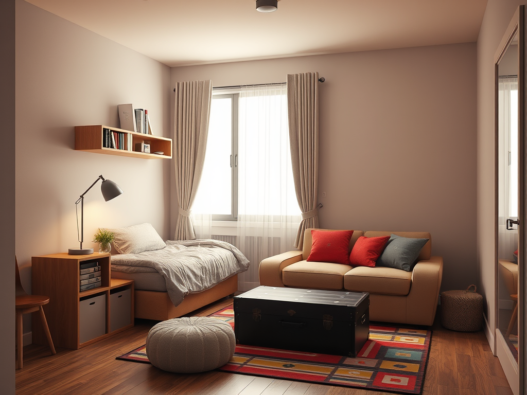 - Meubles compacts : Choisissez une petite commode ou un meuble TV avec rangements pour centraliser vos affaires.