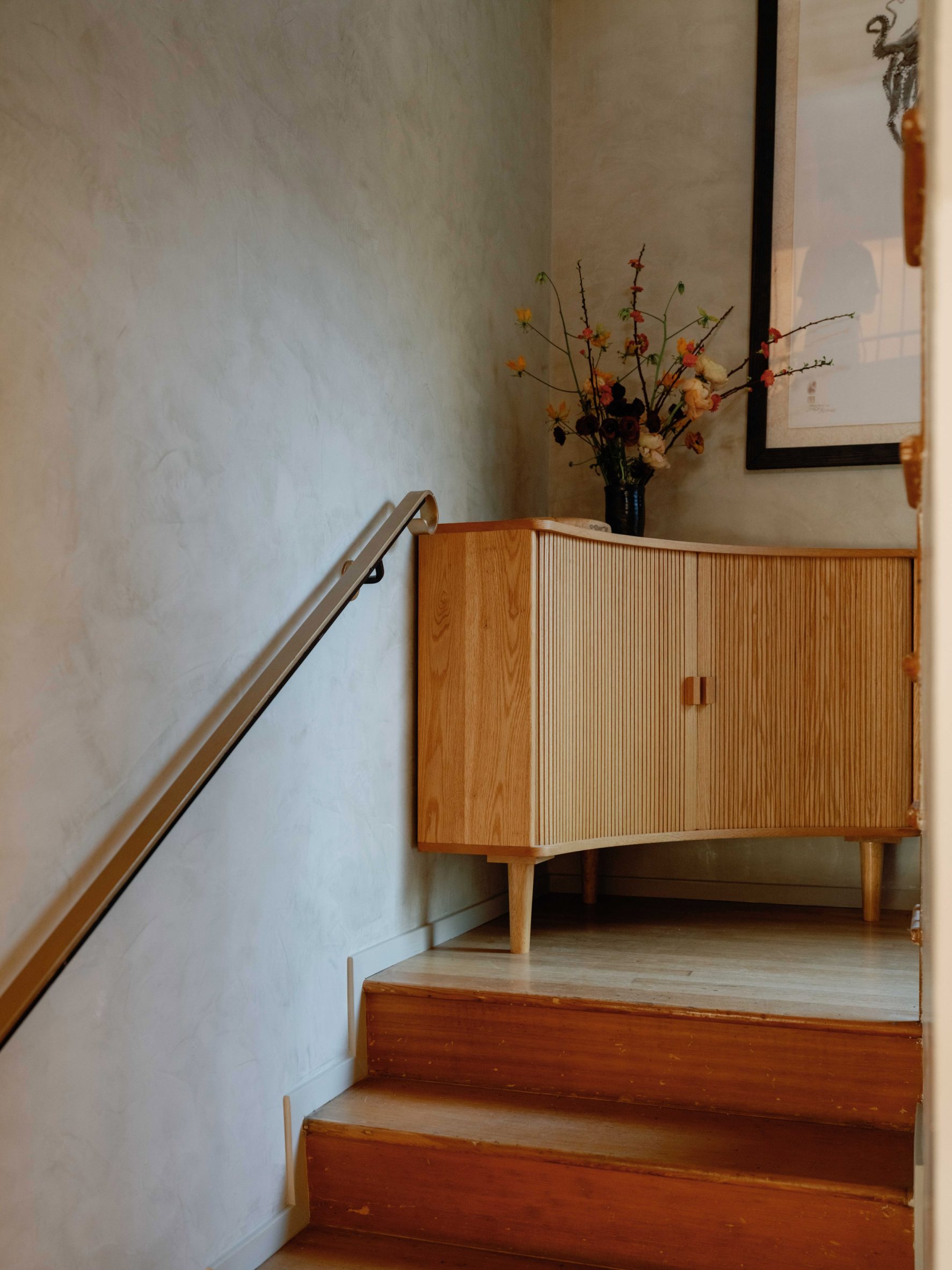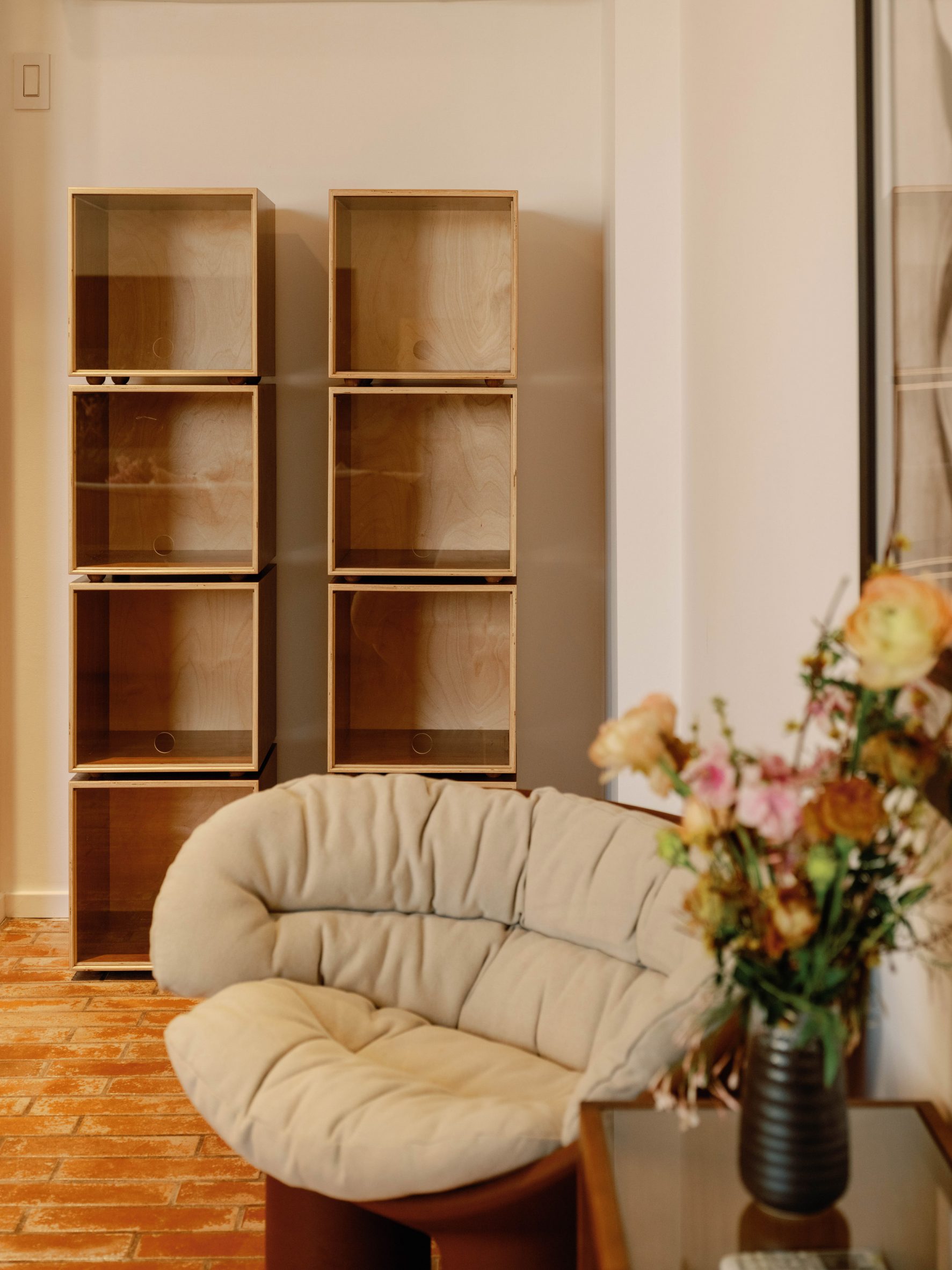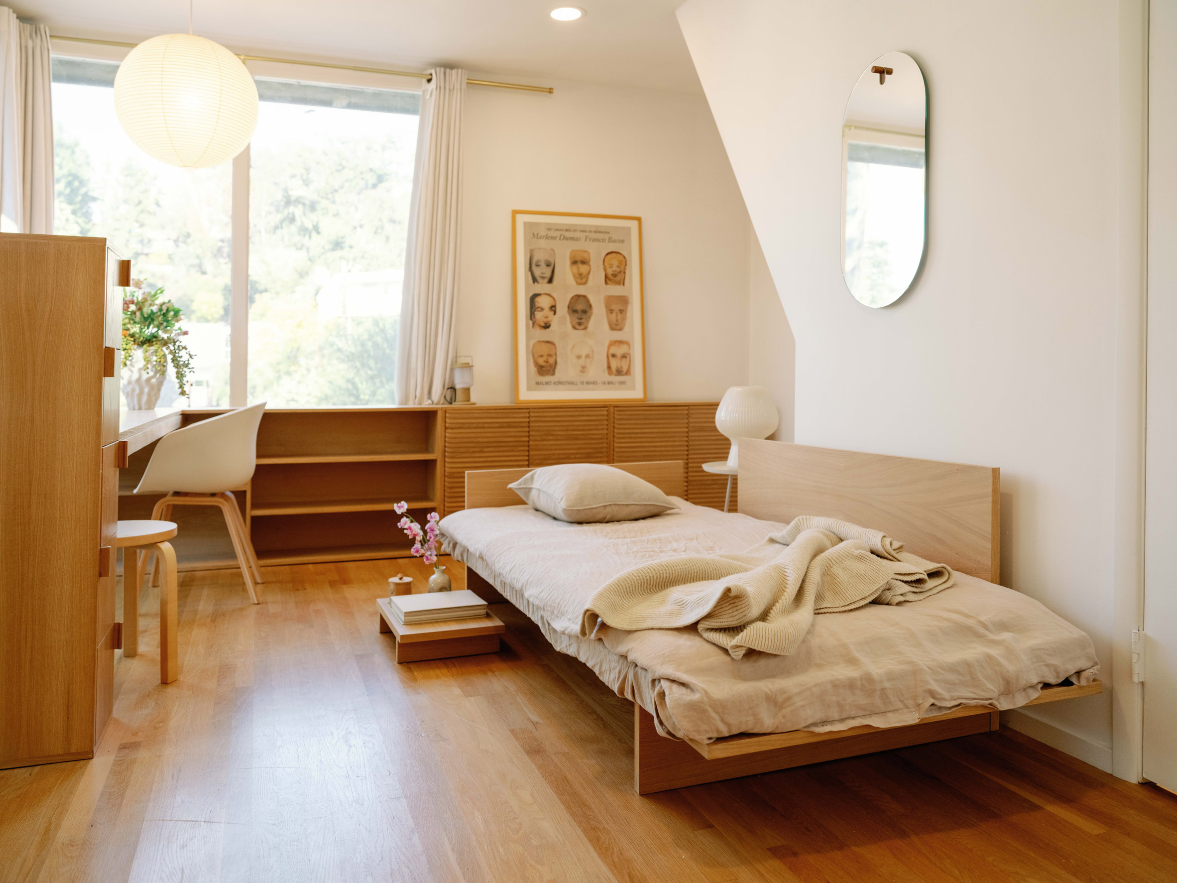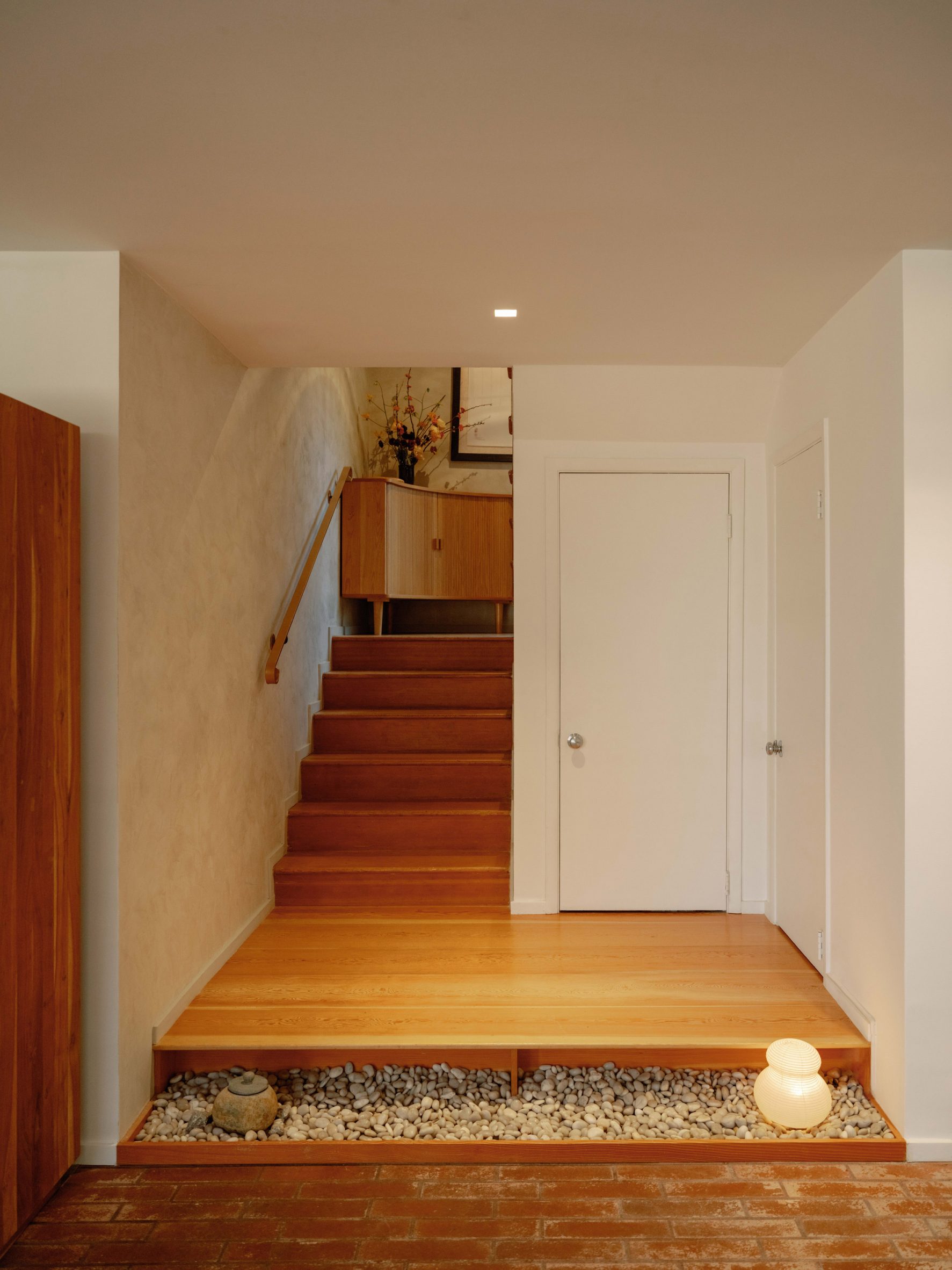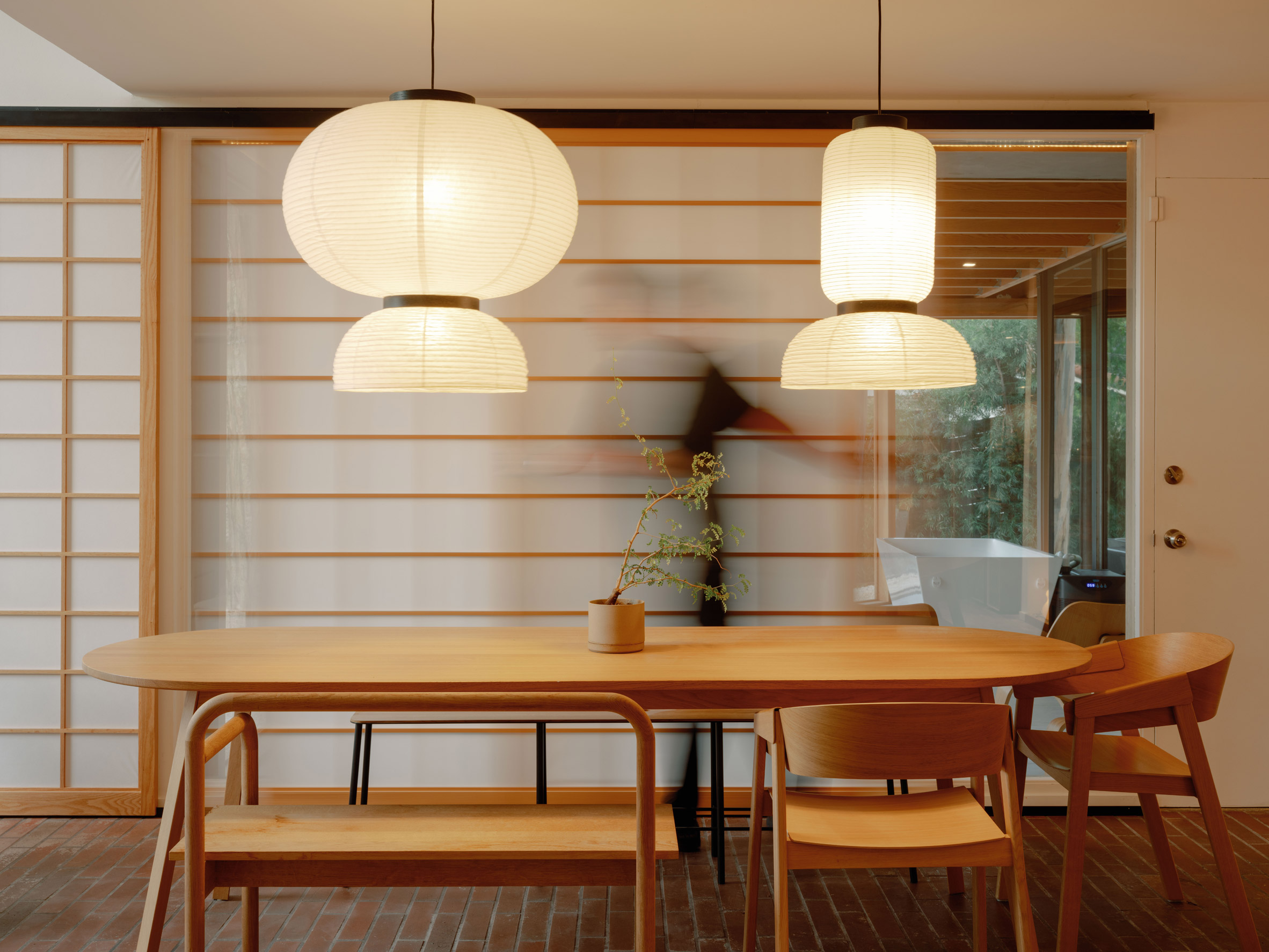 Par exemple, des cloisons coulissantes shoji du sol au plafond ont été installées sur les deux étages pour offrir des options de cloisonnement des espaces et de protection de l’intimité. Le salon baigné de lumière bénéficie d’un plafond à double hauteur et est meublé d’un mélange de pièces contemporaines et Mid-Century, dont une chaise Le Corbusier LC4.