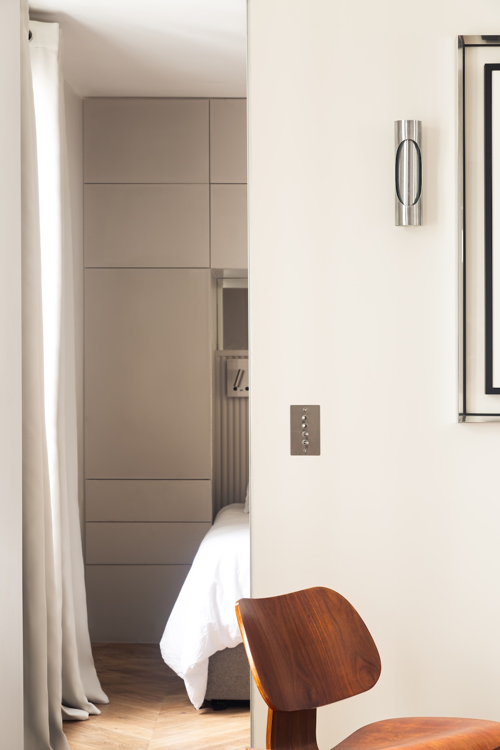 La tête de lit a été créée sur-mesure au moyen de caissons modulables Leroy Merlin et panneau décoratif Orac Decor. Afin de créer une vraie chambre à la place de la cuisine, la cloison séparant les deux pièces a été déplacée. Une porte grande hauteur à fleur de mur a été installée permettant ainsi une concordance de hauteur avec les fenêtres. La porte de service a été condamnée. Un bloc cuisine a été créé avec des caissons IKEA et des façades & SHUFL.