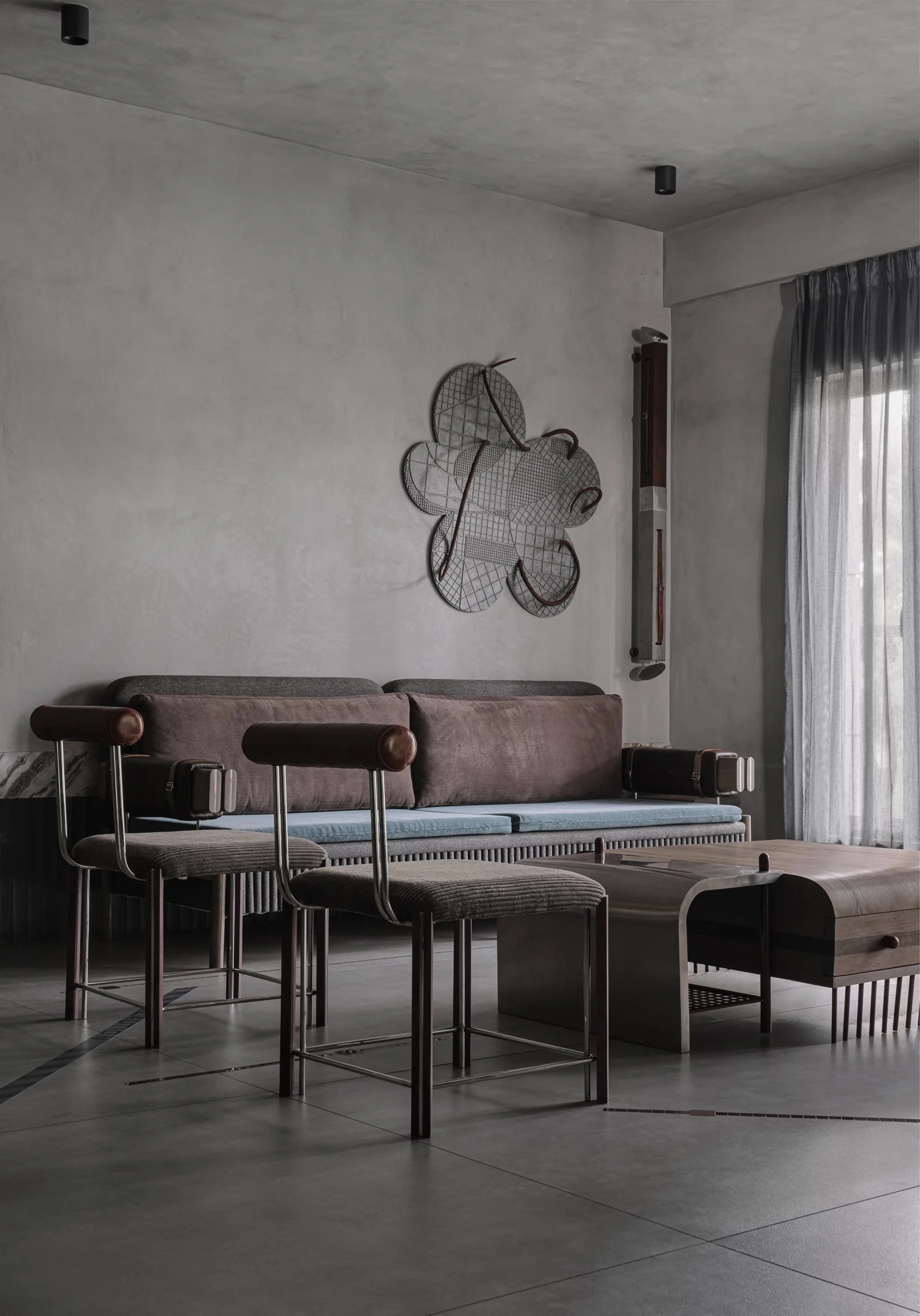 Tous les espaces partagent les mêmes murs gris, tandis que dans le salon principal, Multitude of Sins a créé un sol en béton avec une mosaïque.