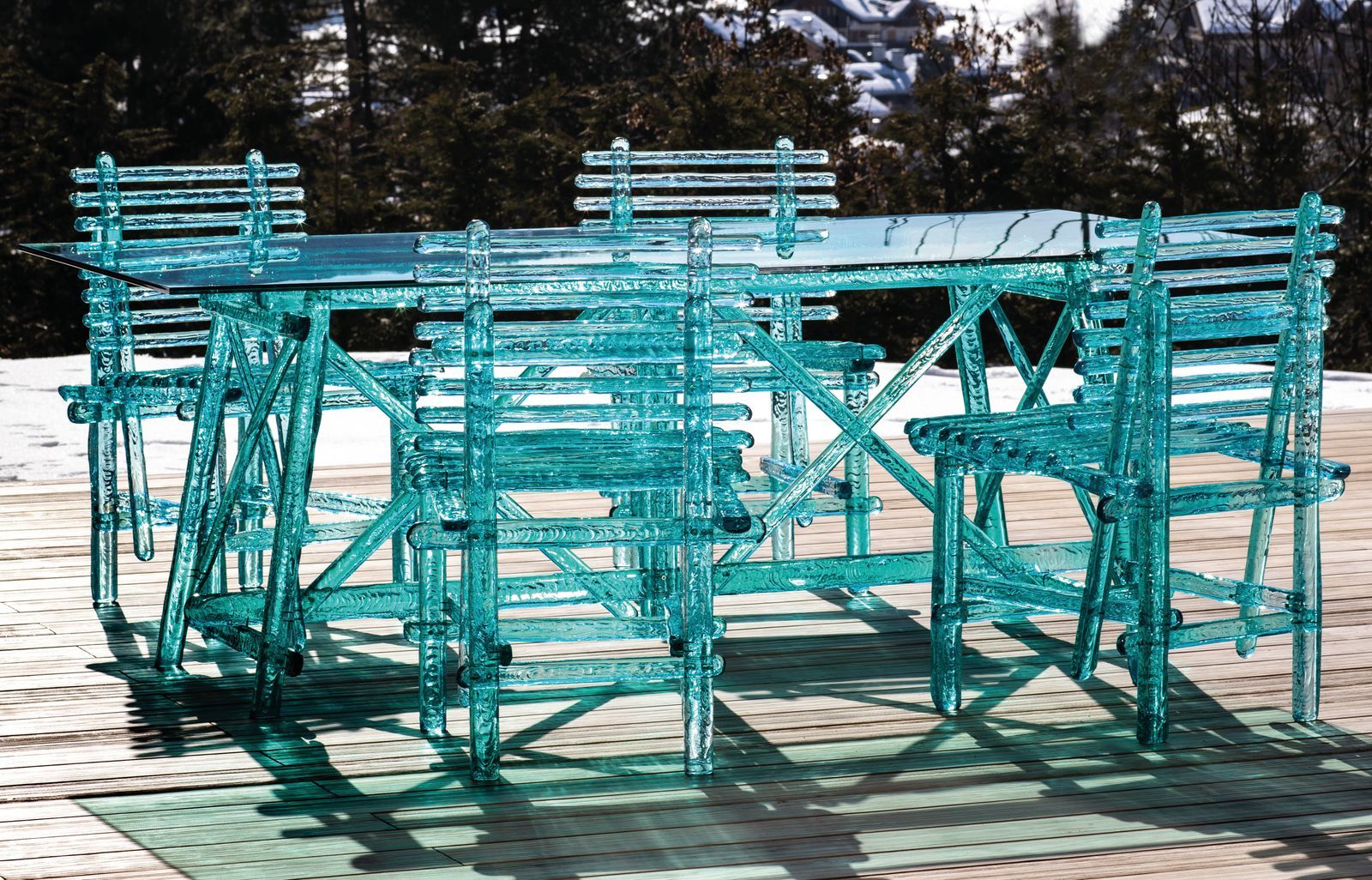 Pour sa première collection de mobilier outdoor baptisée A’mare, de la contraction d’amour et de mer en italien, Edra nous surprend encore avec une série de meubles – chaise, fauteuil, banc, bain de soleil et tables – en lattes de polycarbonate, imaginés par le designer italien Jacopo Foggini…. Un matériau inédit, aux reflets vert-bleu évoquant irrésistiblement les nuances de l’eau, capable de disparaître une fois immergé ou de se parer de reflets ondoyants lorsqu’il est exposé au soleil… Fabriquées une à une artisanalement, ces lattes d’apparence rigide, mais légèrement élastiques en réalité, sont positionnées de manière à créer une trame souple et résistante, notamment sur les assises, pour un confort optimal en extérieur.