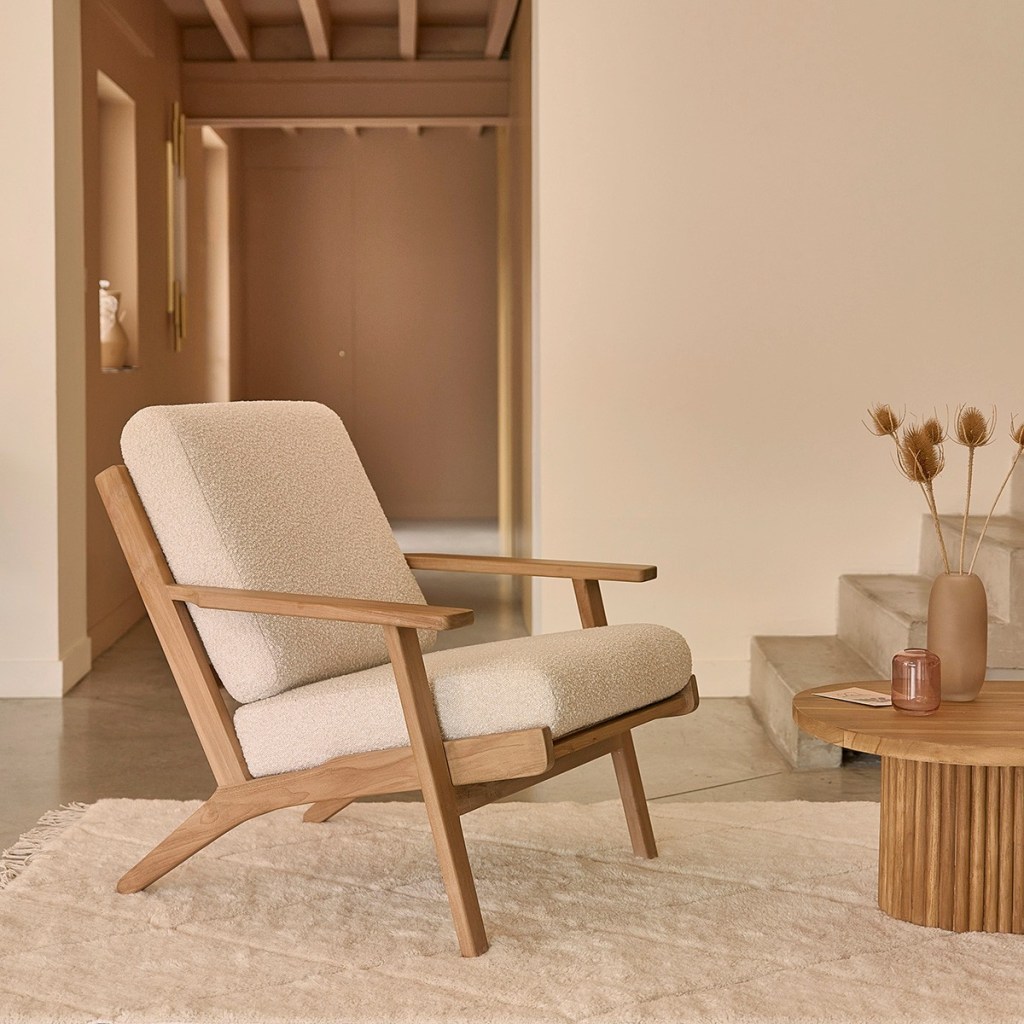 Ce fauteuil en teck massif avec assise bouclette allie confort et style contemporain. Ce meuble de salon devient la pièce maitresse de votre espace.Fauteuil en teck massif et tissu bouclette SERENE Berah Getah 579 €