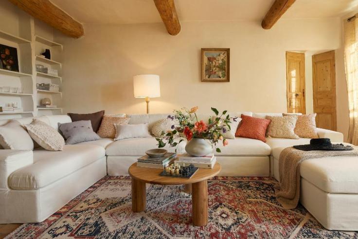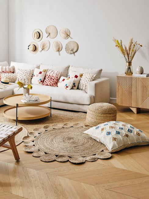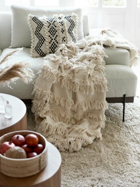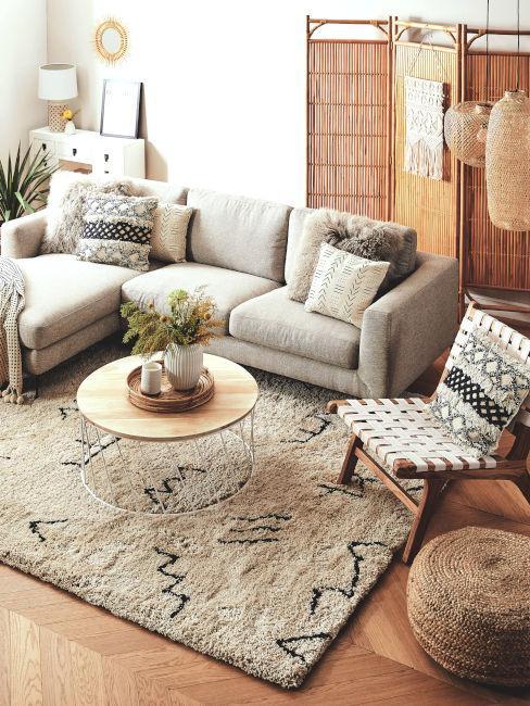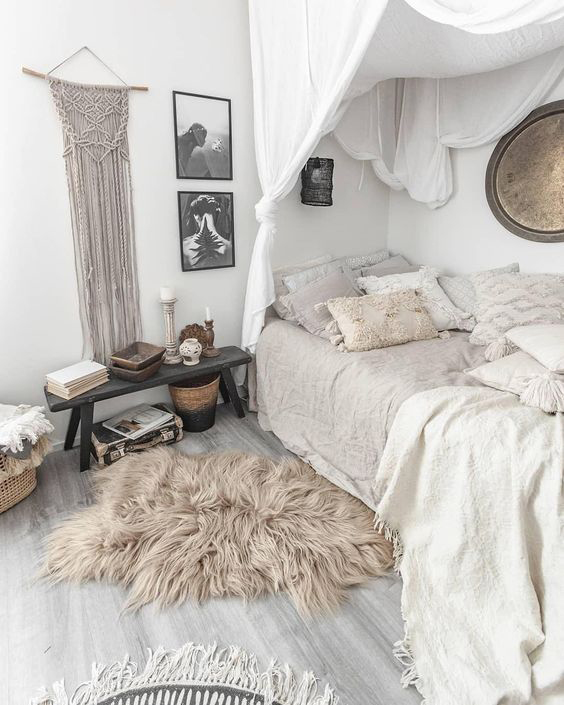 Pour avoir un salon bohème chic, on utilise généralement le blanc comme couleur principale avec quelques touches de noir et de gris. Puis, pour agrémenter l’ambiance bohème, on ajoute des éléments de bois, des plaids, et des éléments décoratifs couleur or.