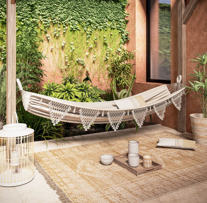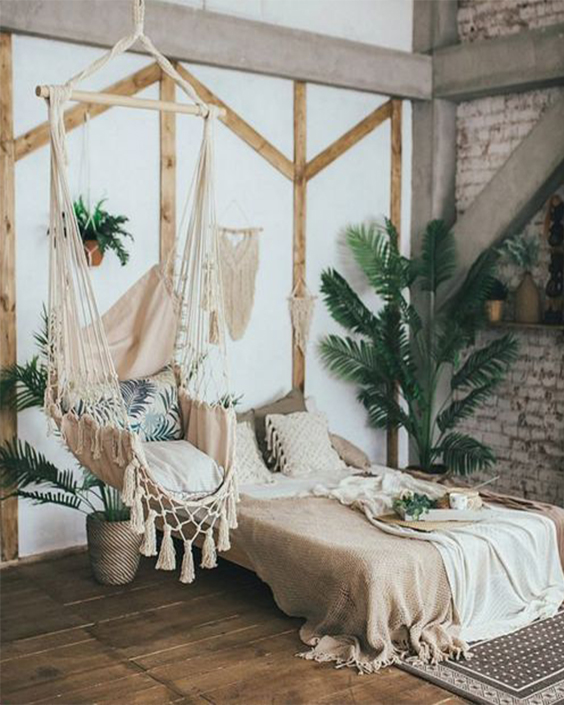 Pour un style bohème réussie, le tapis berbère est la touche par excellence. Noir et blanc de préference, il saura apporter une touche chaleureuse à votre intérieur. Le panier tressé est un incontournable de la déco bohème, il est à disposer partout et peut servir de rangement ou de cache-pots pour les plantes par exemple. Il apporte un côté ethnique et original.Le hamac est considéré comme l’élément ethnique par excellence pour une ambiance cocooning, folk et bohème !