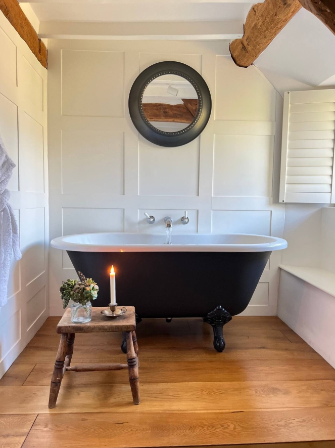 De charmants détails sont présents dans la décoration, comme le poêle à bois, ou la baignoire sur pieds. Le toit de la maison, en chaume, ajoute du charme supplémentaire à cette jolie demeure anglaise qui ressemble à un cocon rassurant. Et non loin, le village vous invite à découvrir son pub traditionnel, un incontournable de la vie britannique.
