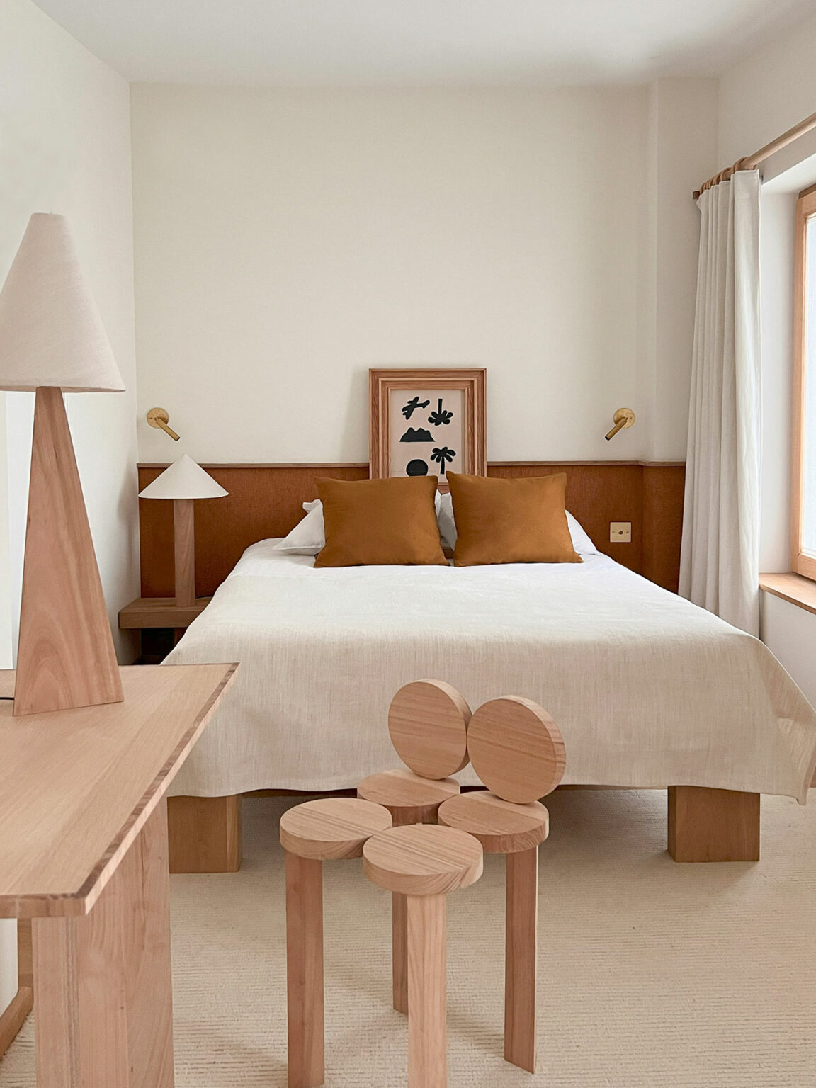 Dans toutes les chambres de l’hôtel, Policronica a exploité des matériaux bruts, tels que le bois, les fibres végétales, le laiton et les tissus neutres, pour former un intérieur monochrome et organique qui est tout sauf fade. Chaque chambre évoque le sentiment d’être chez soi, si l’on vivait dans un appartement parisien élégant, avec chaleur et confort en plein milieu d’un environnement urbain.