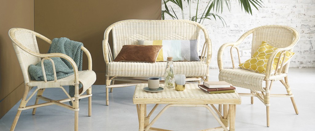 Cet ensemble de salon en rotin naturel se compose de deux fauteuils, d’un canapé et d’une table basse.