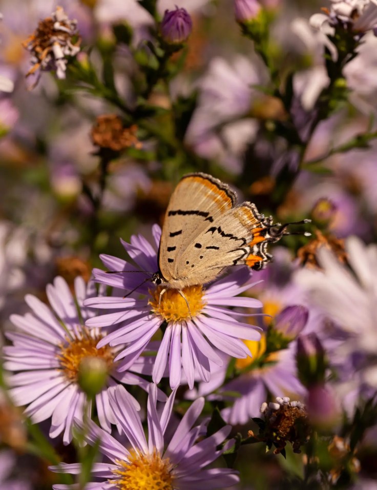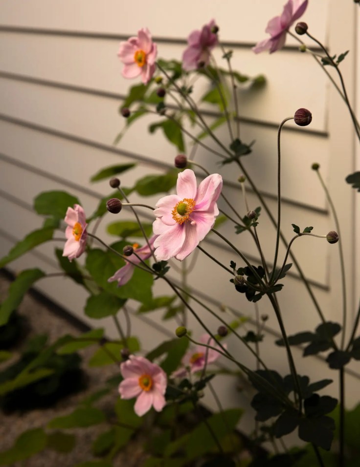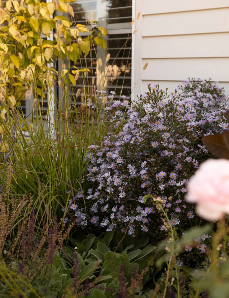 Le jardin est particulièrement animé en automne grâce aux plantations de symphyotrichum cordifolium violet (aster « bleu de bois »), aux fleurs d’anémone huphensis rose pastel (anémone japonaise) et aux fleurs d’helenium autumnale (éternuement commun) jaune vif