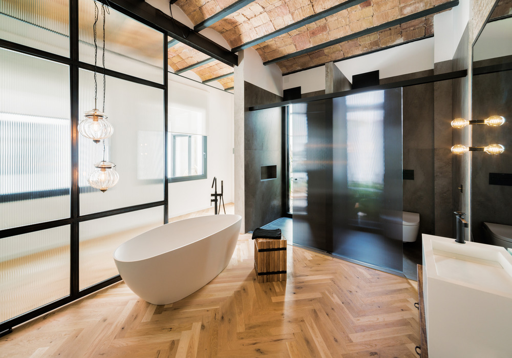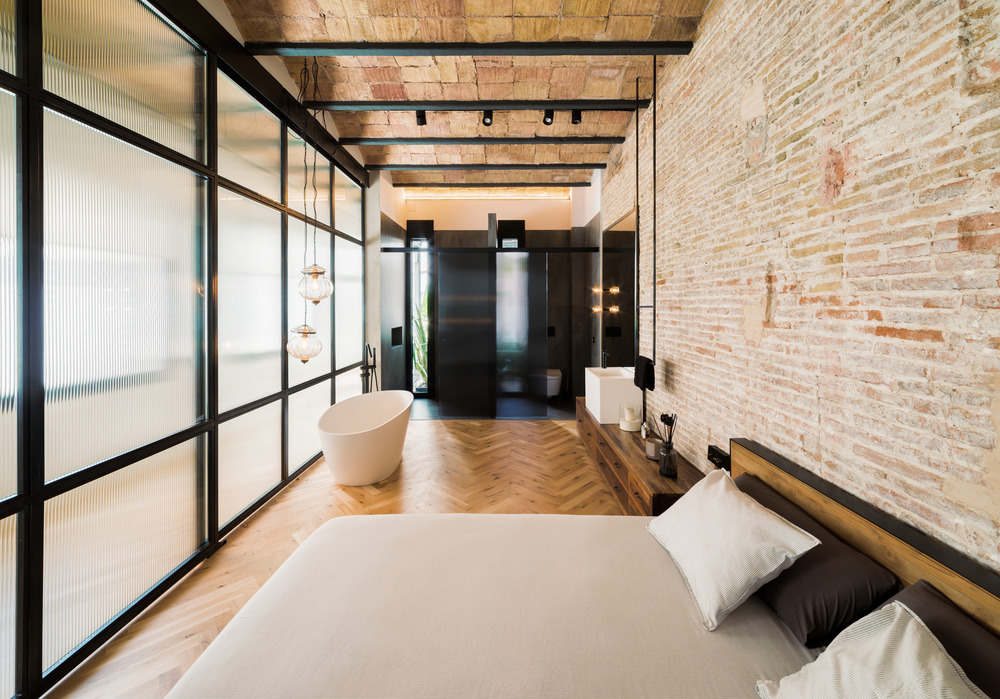 Une grande porte vitrée coulissante donne accès à la suite. Un dressing, une chambre et un espace salle de bain se trouvent dans la même pièce, avec douche et toilettes donnant sur cour, fermée par la même vitre coulissante. Quand l’une est ouverte, l’autre reste fermée. Au pied du lit se trouve une baignoire autoportante et la pièce est complétée par l’ajout de meubles conçus sur-mesure.