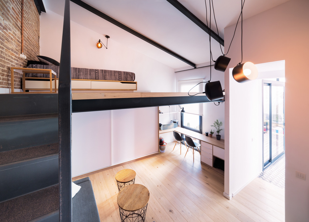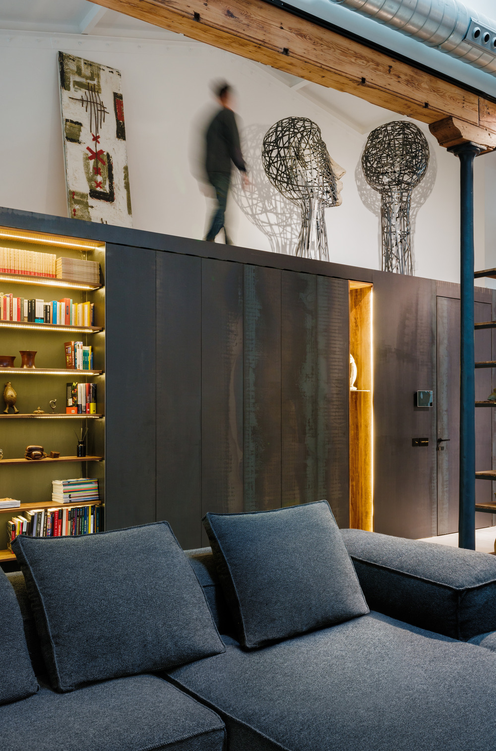 Les escaliers sont en tôle pliée, et la tôle a également été utilisée pour concevoir le mobilier qui intègre la cuisine, un dressing à l’entrée et une bibliothèque.
