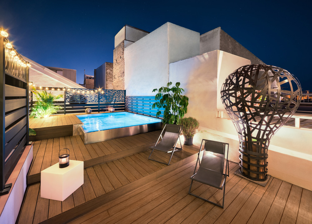 Le toit-terrasse a été entièrement rénové, avec une terrasse extérieure ainsi qu’une piscine à débordement en acier inoxydable.