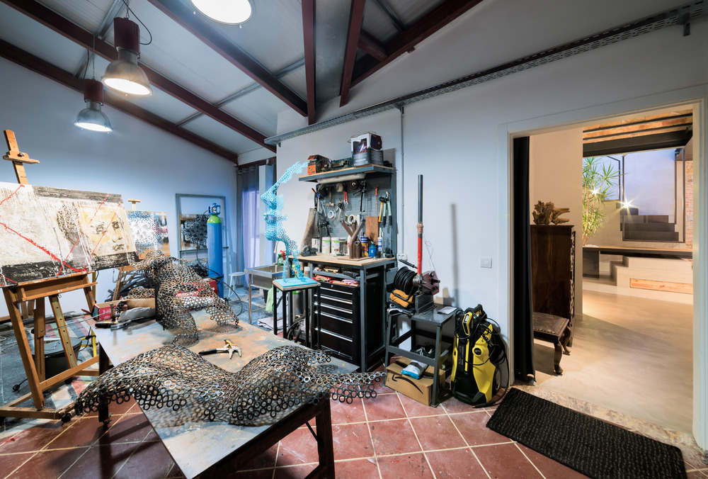 Au-delà du salon, on découvre l’atelier du propriétaire, conservé tel que le propriétaire l’a créé. Il y a aussi une salle de bain avec un évier sur-mesure en acier inoxydable émaillé au feu, qui fait face à la fenêtre.