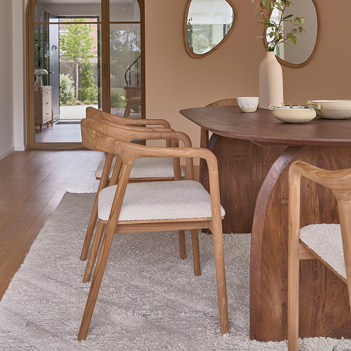 Avec ses nombreux atouts et son design raffiné, la chaise AMBRE en teck massif avec assise en tissu bouclette deviendra rapidement votre assise préférée, vous invitant à savourer chaque moment de détente et de convivialité dans votre séjour.Lot de 2 chaises en teck massif assise bouclette AMBRE chez Berah Getah 539