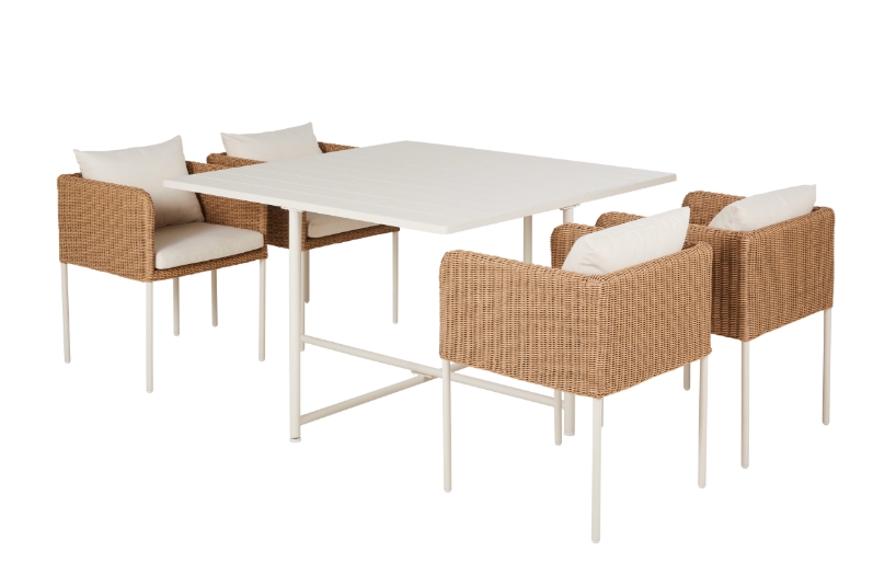 Iseo – Ensemble table et 4 chaises de jardin en métal écru et résine recyclée beige c’est une solution élégante et pratique pour profiter de vos repas en extérieur. 599,00 €