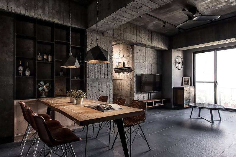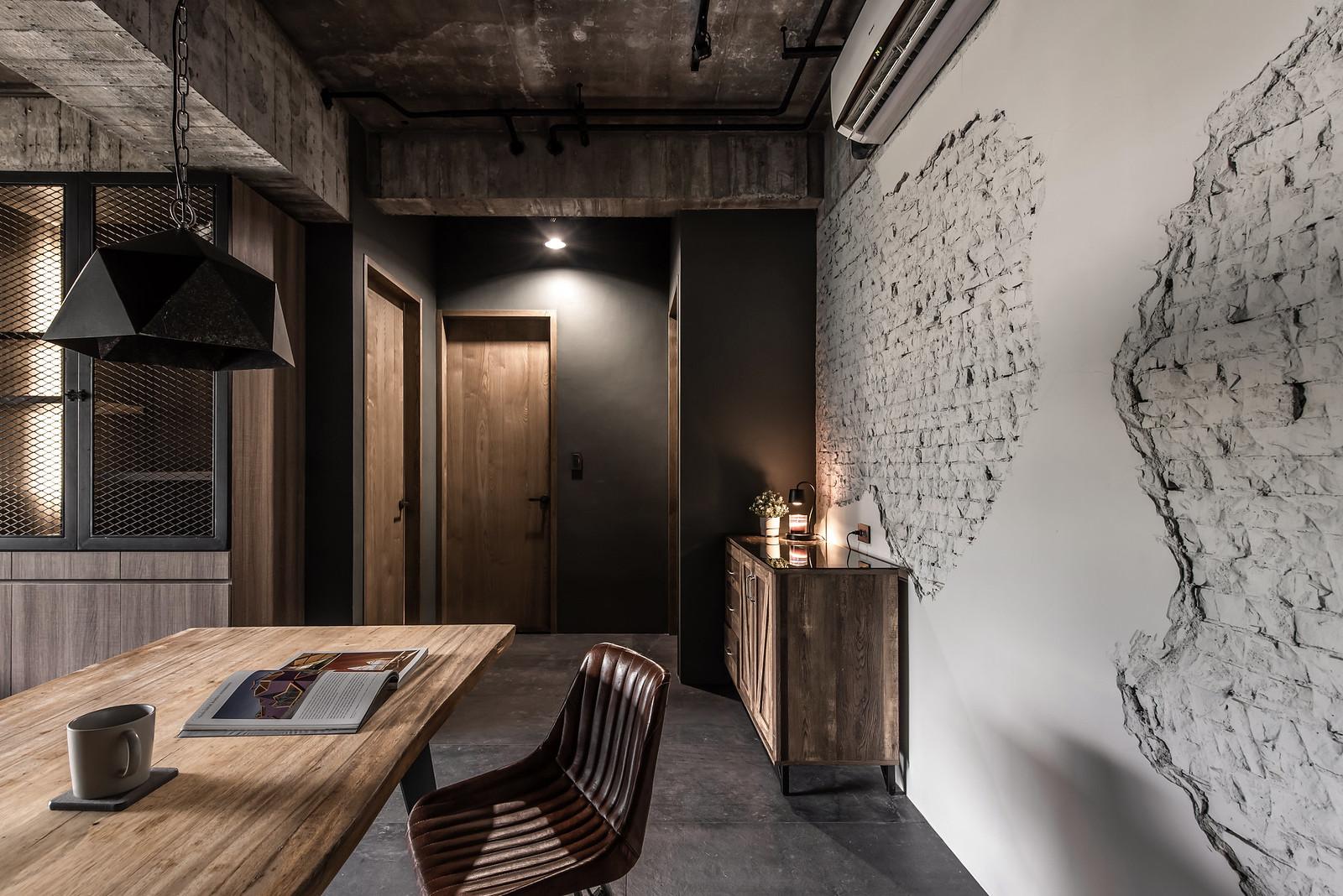 Cet appartement situé à Taïwan dans un immeuble ancien, présente une décoration influencée à la fois par le style industriel, avec l’emploi d’acier et de béton, ainsi que par le wabi-sabi (Le terme japonais Wabi Sabi désigne l’appréciation du vieillissement et la beauté des choses simples et imparfaites. Tandis que la recherche de possessions matérielles et de perfection absolue constitue le facteur d’une vie insatisfaite.), cette philosophie japonaise qui voit de la beauté dans les choses imparfaites . Son propriétaire est un entrepreneur qui possède des salons de coiffure, et est un grand voyageur. Il s’est inspiré de ses voyages et de ses souvenirs d’enfance pour créer cet univers unique en collaboration avec le studio de design House Plan, où la brique se découvre derrière un enduit, ou le vieux bois amène la chaleur nécessaire à cet univers très sombre, où l’imperfection côtoie la perfection en parfait équilibre