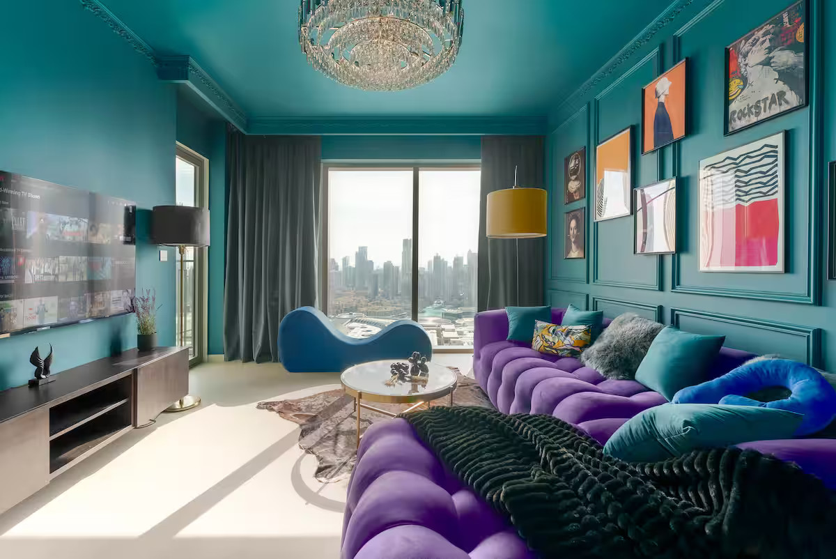 Living in Dubai No thanks…. LIVING IN A TOWER EVEN LESS with a more or less pleasant view, a bit like everywhere. Located on the 35th floor, this apartment in Dubai offers a view of the famous Burj Khalifa. We all know that this building has been the tallest in the world since 2008, with its 828 meters. It is therefore a bit like the “Eiffel Tower” of the country on which the windows of this apartment overlook. But my curiosity was such that I had to present this extravagance to you, bright colors and designer furniture. These are bold choices, which do not suit everyone, but we cannot say that it lacks originality…. THIS APARTMENT IS FOR RENT who is interested….