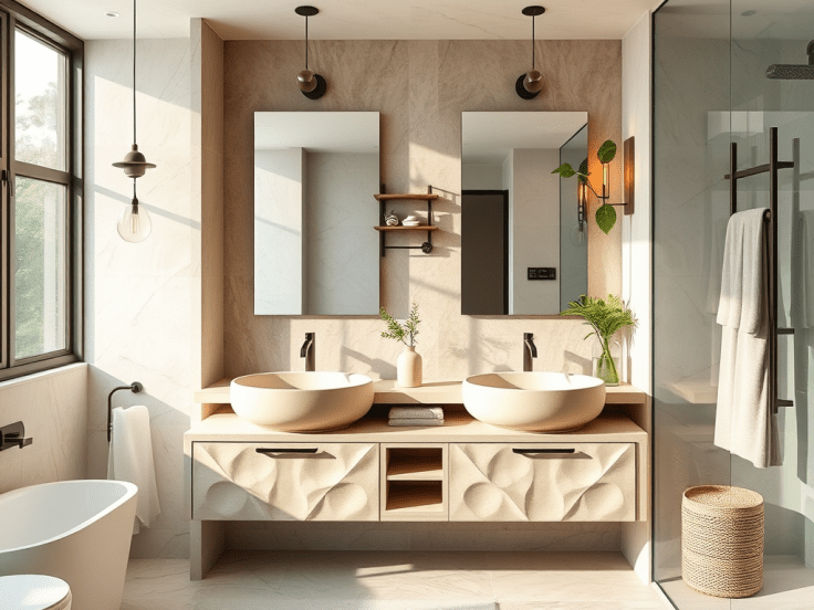 Cette vasque en béton beige texturé est le choix parfait pour une salle de bain moderne et élégante.