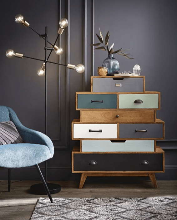Picadilly – Chiffonier vintage en manguier massif multicolore Misez sur l’originalité avec le Chiffonier vintage PICADILLY en manguier ! Avec ses nombreux rangements colorés, ce meuble de rangement sera idéal dans une chambre ou un salon pour apporter une petite touche vintage. Le détail déco : les tiroirs et les poignées en métal, tous différents ! 499,00 €