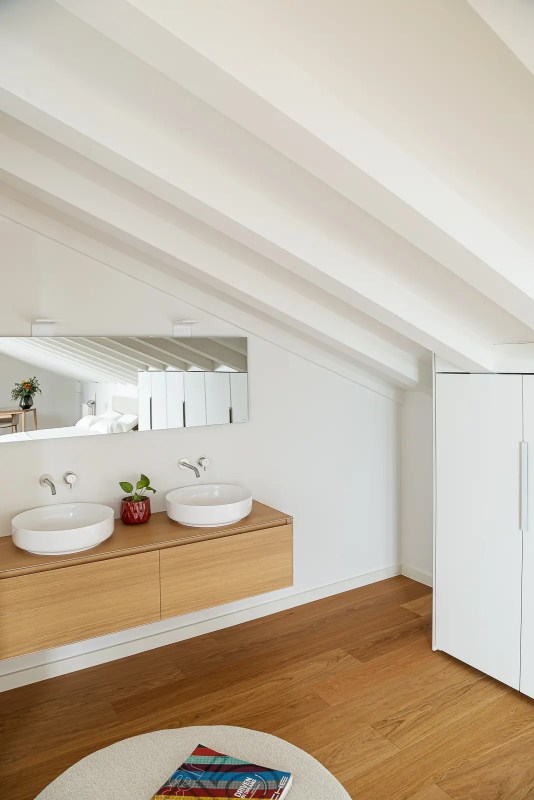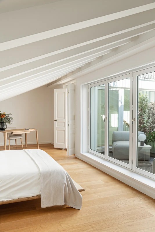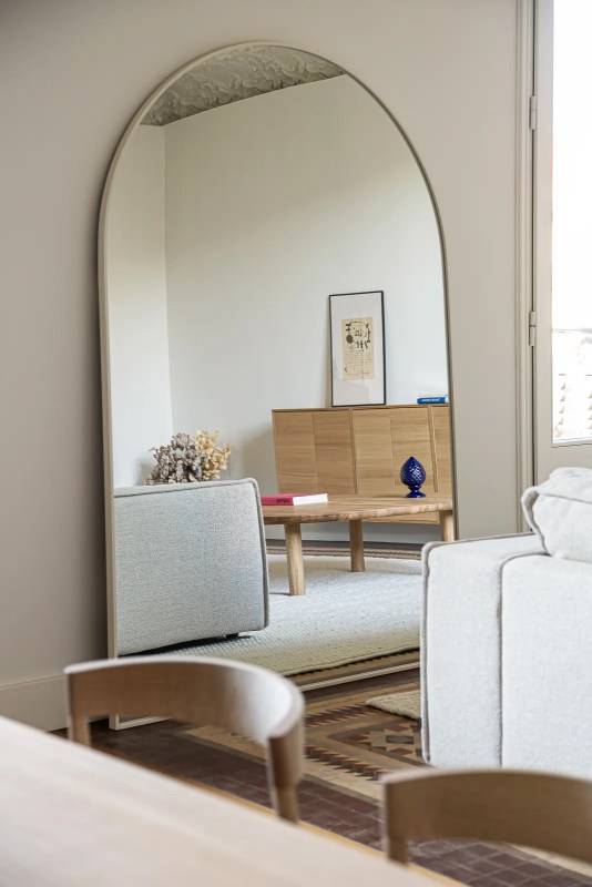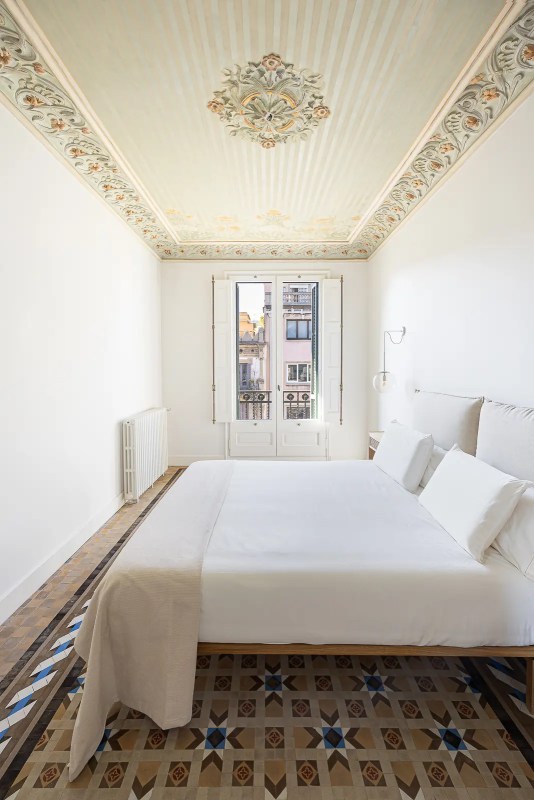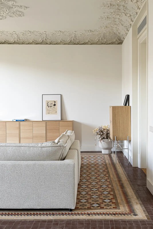 Cet appartement entre design et classique mélange les éléments anciens soigneusement sauvegardés, comme les magnifiques sols en carrelage polychrome, ou les stucs du plafond, et un esprit contemporain, sobre et intemporel. On remarque les magnifiques moulures en couleurs qui ont été conservées pendant la rénovation de cet appartement . La décoration intérieure accueillante et fraîche allie harmonieusement le style traditionnel à des touches fonctionnelles, telles que l’intégration du salon et de la cuisine, séparés par des écrans de verre coulissants pour maximiser la lumière naturelle et économiser de l’espace.