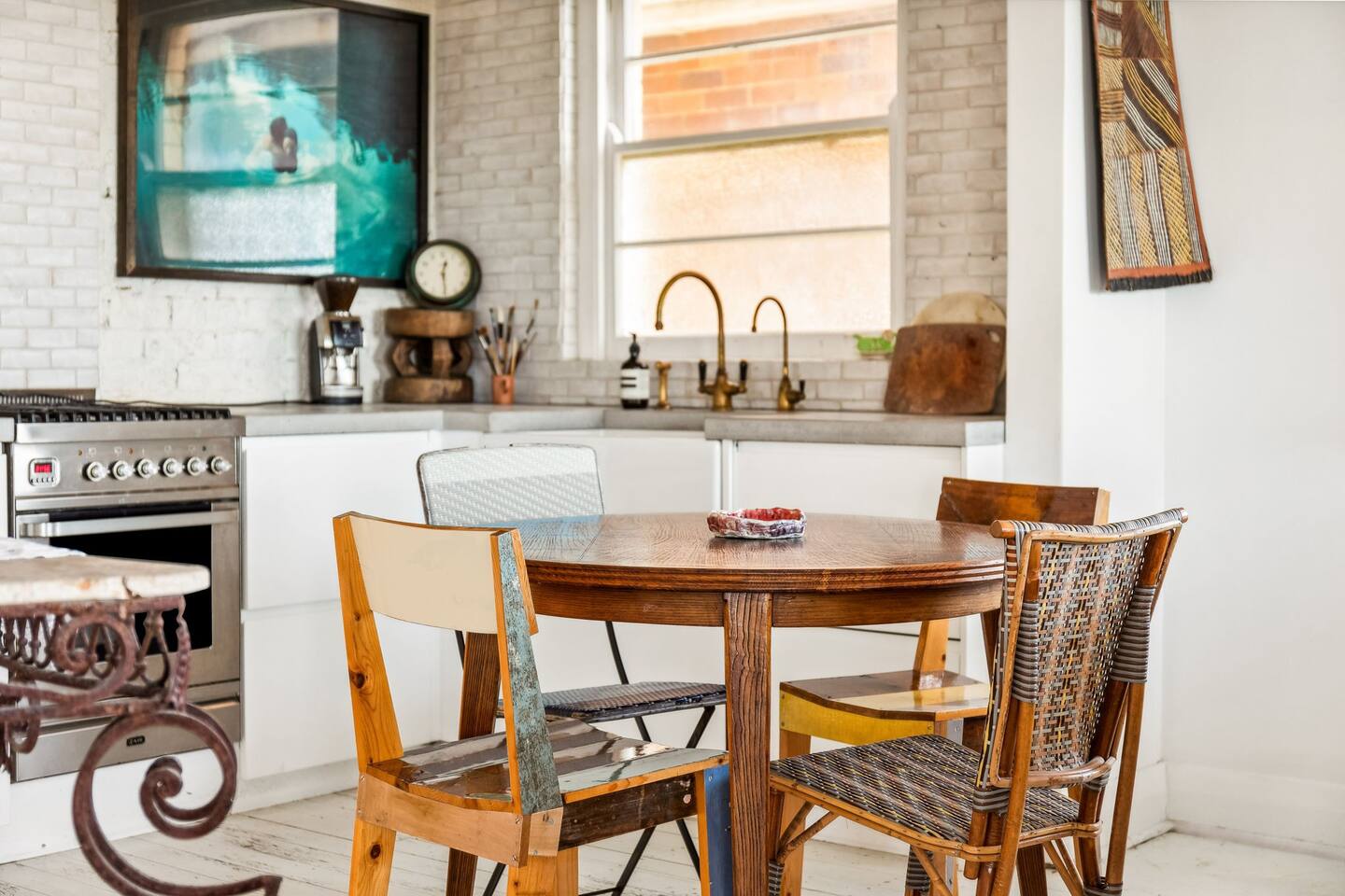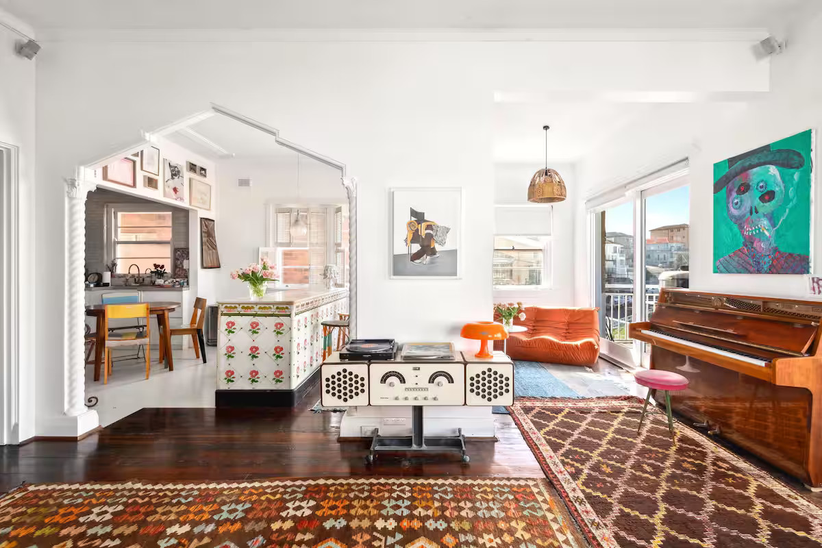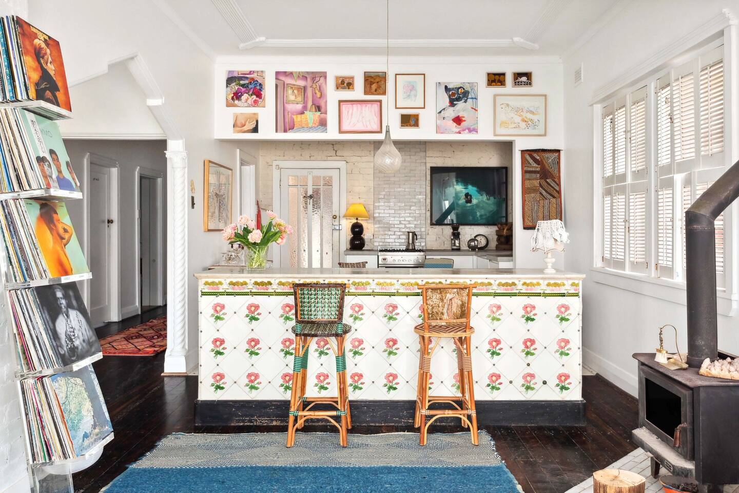 Le mélange des couleurs que l’on trouve sur les tapis kilims anciens, dans le papier-peint fleuri du bar, et les œuvres d’art en font un cadre plein de créativité et de joie de vivre. L’esprit est vintage mais avec une touche folle . Les espaces extérieurs sont également réussis, comme le joli petit jardin à l’arrière, il y a aussi la vue sur le rivage . Ses propriétaires sont deux artistes qui on exprimé ici leur sens de la couleur et leur amour pour des éléments uniques. Cette jolie maison a eu les honneurs des magazines australiens et c’est compréhensible, tant à cause de sa décoration, que de son emplacement privilégié.