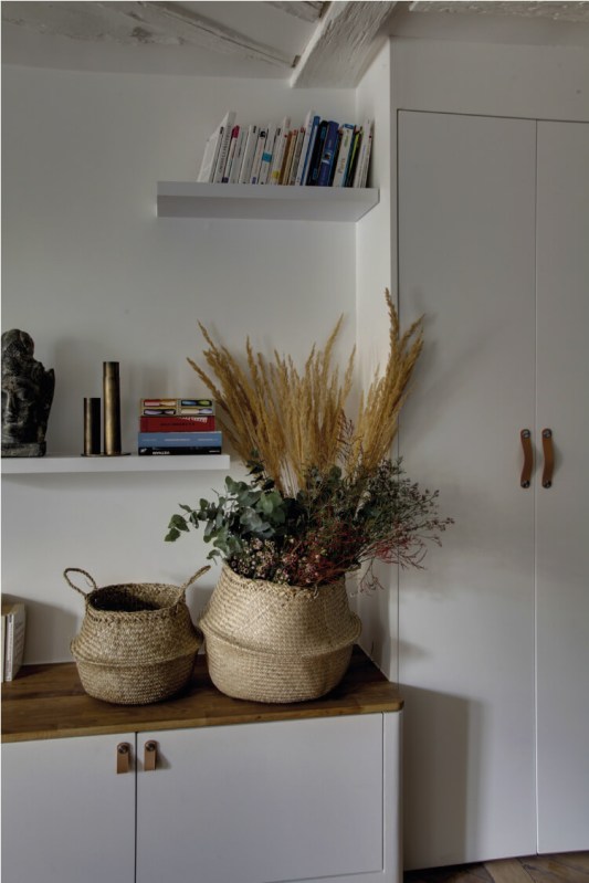 Maureen Karsenty a opté pour conserver le charme, l’âme parisienne, de l’appartement : les tomettes et le beau parquet en point de Hongrie (à réparer par endroit). Afin de faire ressortir ce coté maison de vacances, elle a travaillé des teintes claires, autour du beige, combinées à différentes teintes de vert pour le coté « végétal »