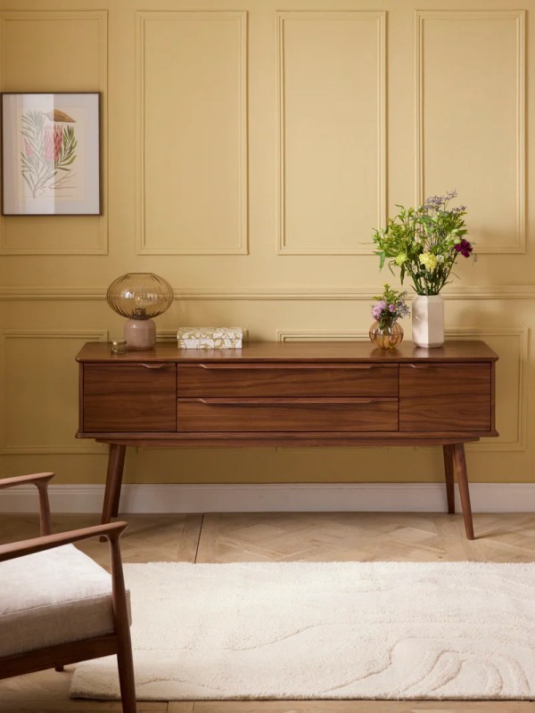 Meuble enfilade en placage noyer inspiré des buffets scandinaves des années 60. Ses pieds fuselés et ses longues poignées en bois massif soulignent cette allure vintage. Un meuble bas ultra-pratique composé de 2 grands tiroirs et 2 placards.