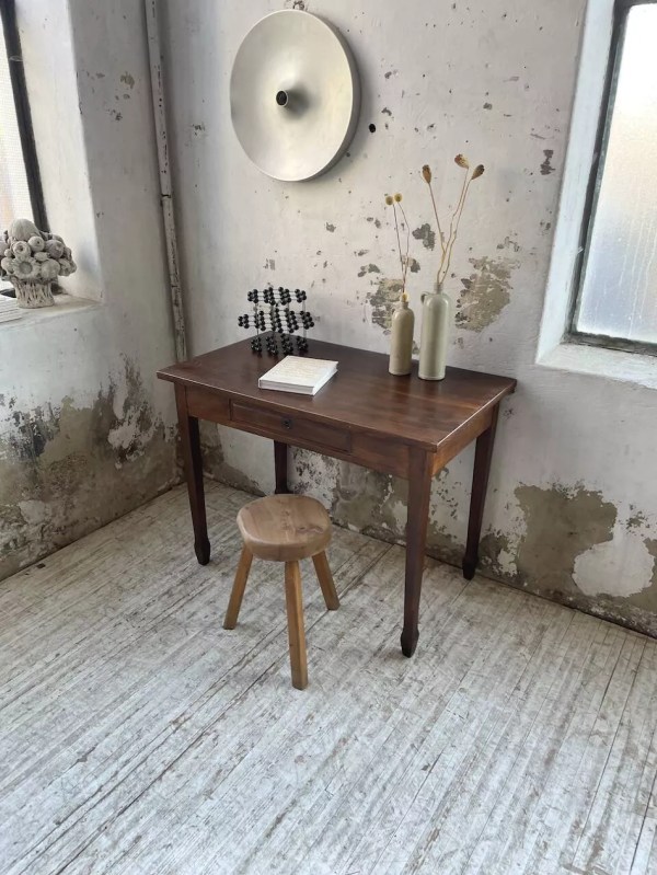 Petit bureau en chêne avec sa teinte foncée. Très élégant avec son mini format et ses très longs pieds fuselés. Un tiroir d’appoint à clé, dont la clé n’est plus présente. Patine d’origine, défauts et marques possibles dans le bois.