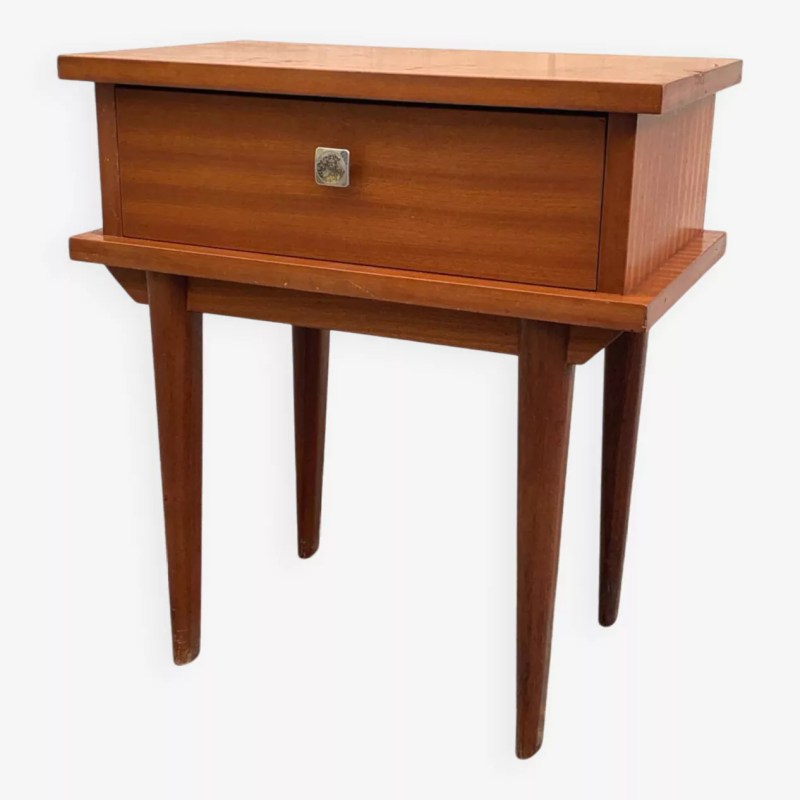Chevet vintage des années 70. La patine est d’origine. Elle a été ravivée avec des produits spécialisés. Des taches d’usage subsistent, mais n’entachent pas l’esthétique du meuble. Stable et solide.