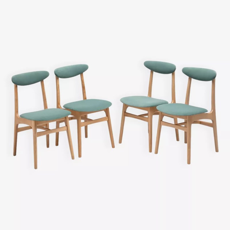 Le projet emblématique du design industriel polonais des années 1960. Les chaises ont été conçues par le professeur rajmund teofil hałas, ces chaises ont subi une rénovation complète. Les cadres en bois ont été nettoyés de l’ancienne couche de vernis, teints de couleur brune et protégés par plusieurs couches de vernis semi-mat. Le rembourrage sur les dossiers et sur les sièges a été remplacé par du tissu à la mode.