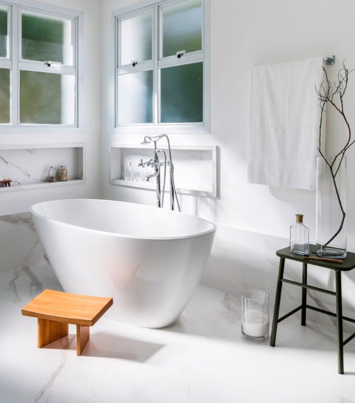 Un espace gourmand extérieur, avec une cuisine extérieure et un coin repas. Mais ce qui est le plus impressionnant, c’est un spectaculaire jardin que l’on peut voir même depuis l’intérieur de la maison. La relation entre l’intérieur et le luxuriant jardin est fluide grâce aux grandes fenêtres qui encadrent la végétation. Un chemin de pierre serpente de la maison jusqu’à l’espace gourmand, invitant à la flânerie et à la contemplation. L’espace extérieur est complété par un coin détente cosy composé d’une