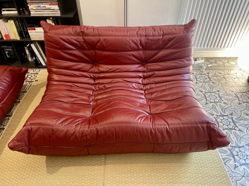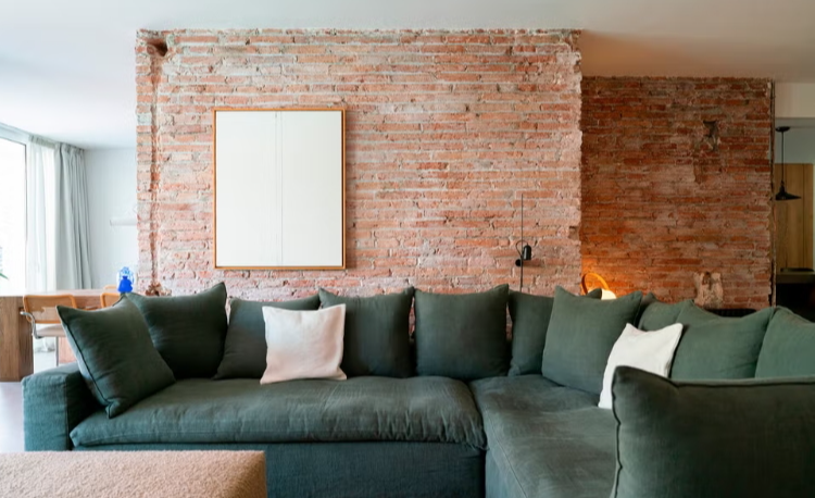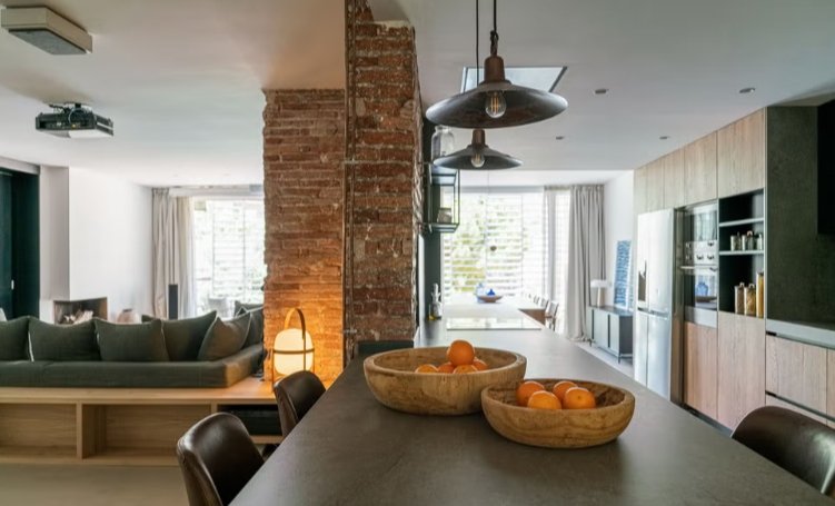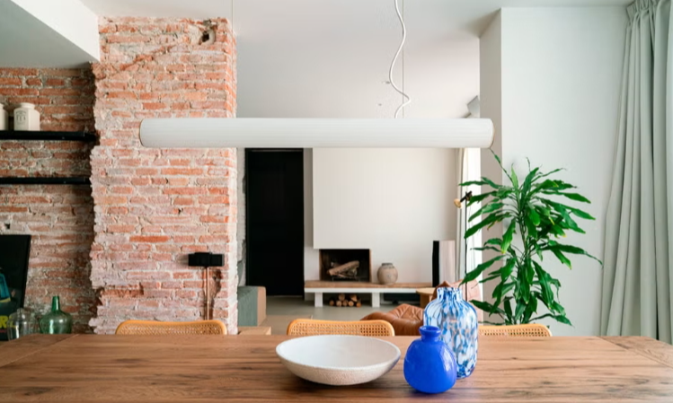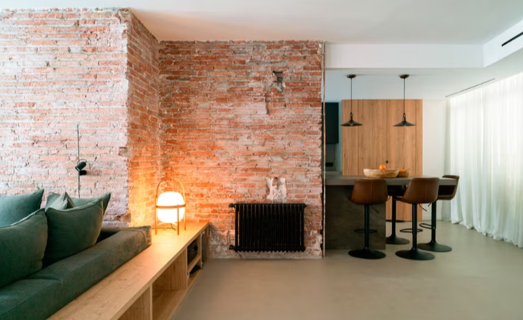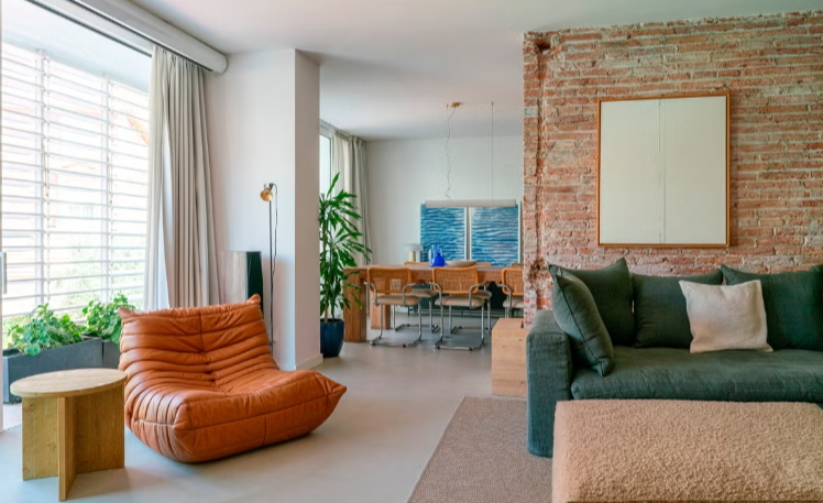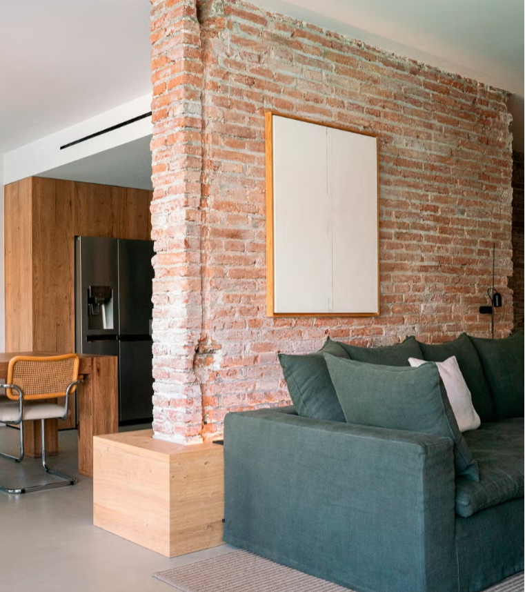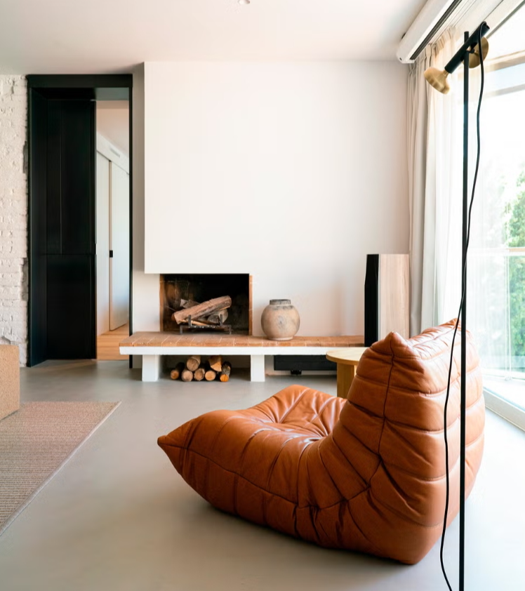 mur principal en briques apparentes récupérées , hommage à la matérialité d’origine du bâtiment. En plus de sa fonction esthétique, le mur agit comme un lien entre le salon, la cuisine et la salle à manger. L’ambiance est complétée par la cheminée d’origine de la maison et un fauteuil Togo, en cuir couleur cognac, qui crée un