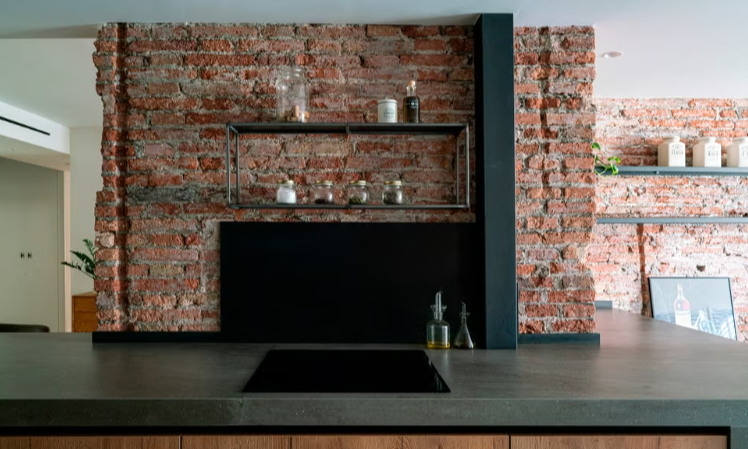 esthétique industrielle avec une palette de couleurs de bruns, de gris et de noirs. Un grand plan de travail en porcelaine gris foncé se distingue, unifiant l’espace cuisine avec une unité centrale équipée de quatre hauts tabourets en cuir dans un ton marron chocolat.