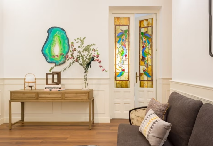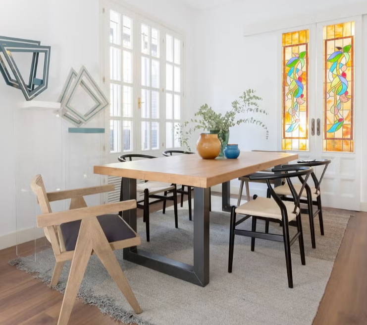 la lumière naturelle est abondante et le blanc prédomine dans toute la maison. En ce sens, vous pouvez jouer avec les couleurs à travers les meubles et la décoration, les vitraux étant une ressource utile et pratique pour ajouter une touche d’élégance et de raffinement. C’est pourquoi le bleu dans différentes nuances et les tons d’automne (or et tons terre, rouges et verts) participent activement aux Fenêtres en vitrail pour remplir les intérieurs de vie.
