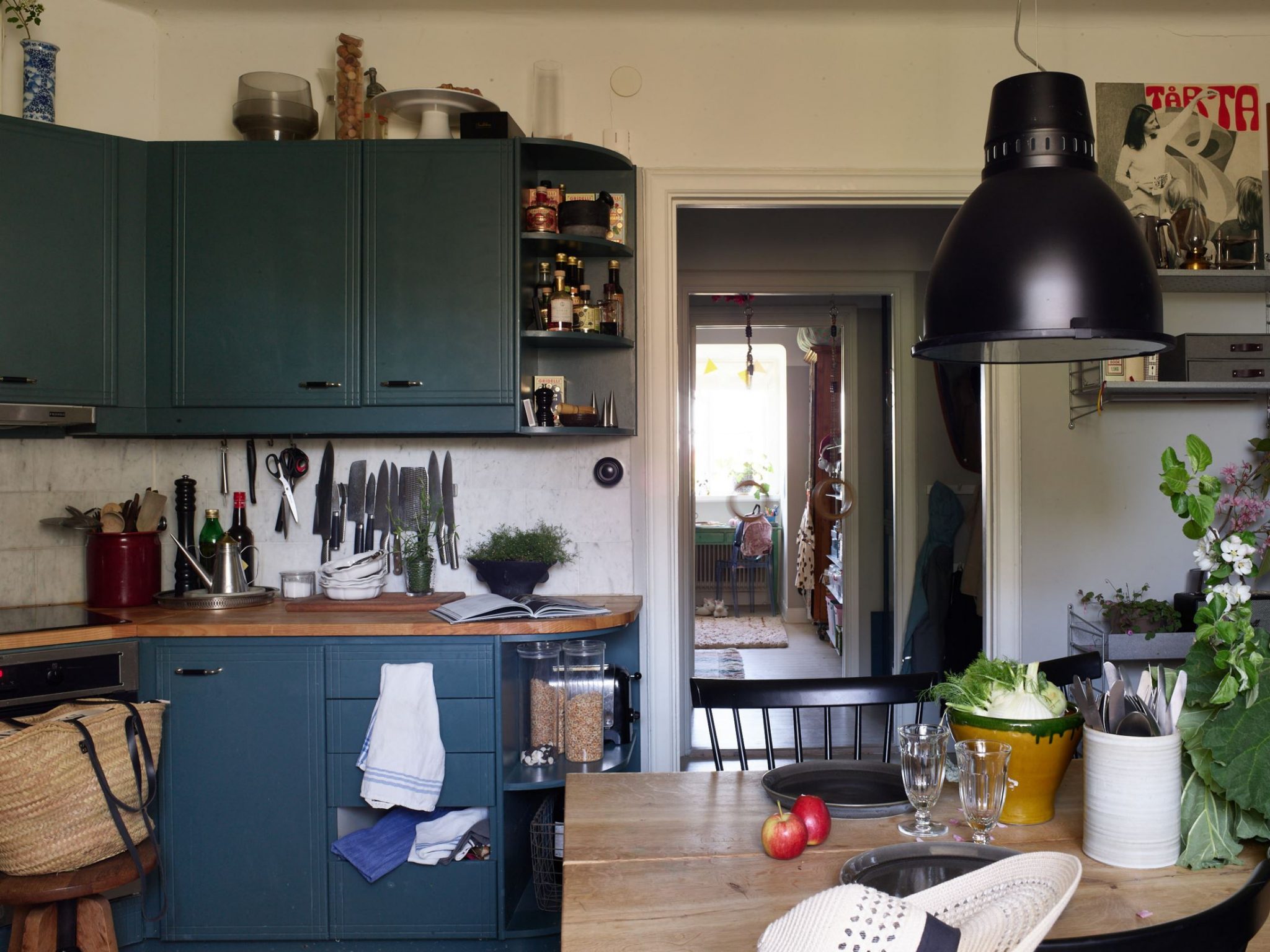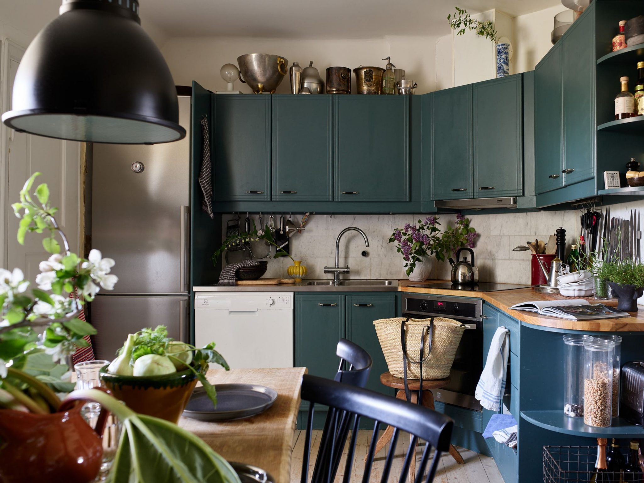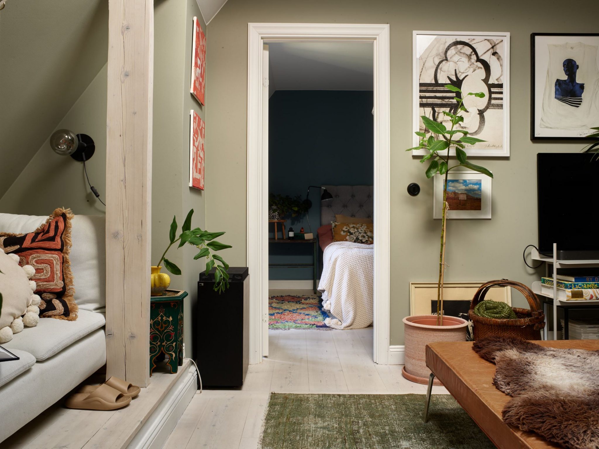 Le salon de l’appartement est spacieux et lumineux avec des fenêtres donnant sur la cour ainsi qu’un puits de lumière. À côté de la pente du toit, le sol est surélevé, ici vous pouvez avantageusement décorer un coin lecture confortable derrière les poutres développées. Une étagère intégrée avec beaucoup de rangement est située à l’entrée de la pièce. Les murs sont peints d’une couleur vert clair et le sol est orné d’un parquet plus clair. Côté cuisine, avec une vue sur les toits. Dans cette pièce aux meubles bleus, le parquet ancien a été conservé, et elle est assez vaste pour accueillir une grande table pour les repas. Les charmantes chambres ont été également décorées avec de la couleur, et leurs volumes biscornus ont été bien exploités. L’ensemble de cet appartement respire une vie décontractée et familiale, et est un régal pour les yeux.