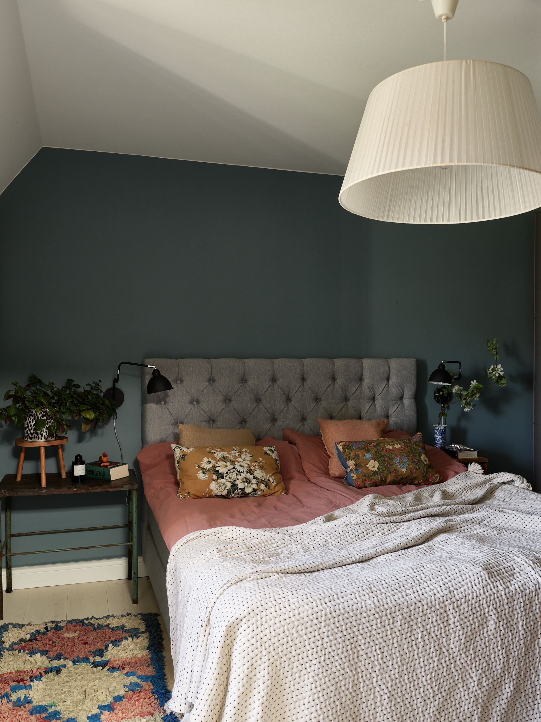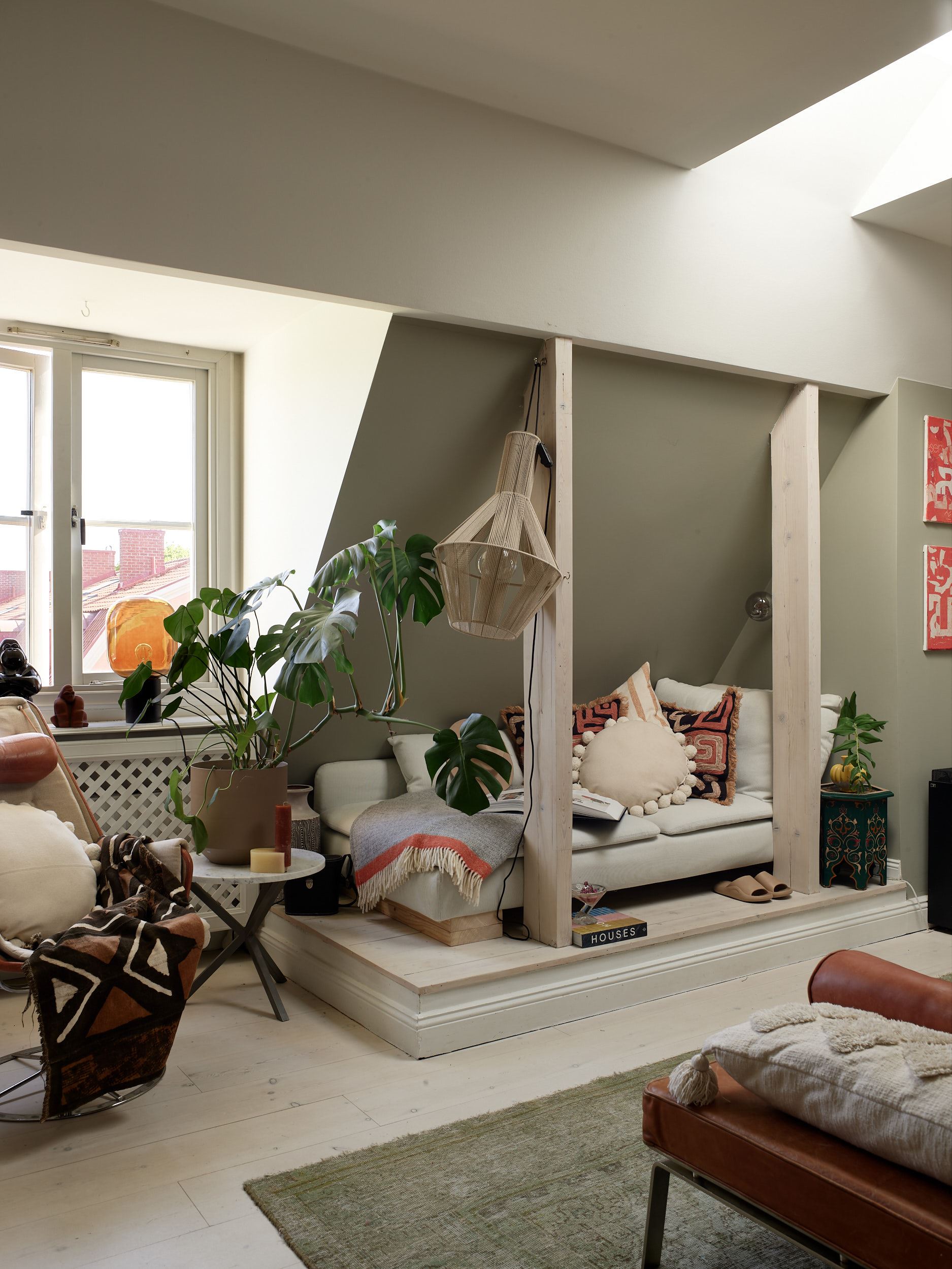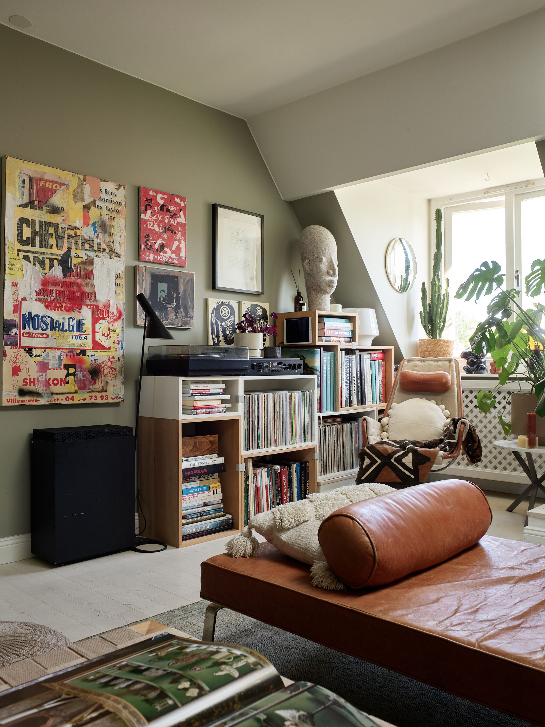 Des couleurs fortes habillent ce charmant appartement vintage. Bien que sa décoration soit assez sombre, il reste lumineux . Les volumes mansardés lui donnent une allure atypique, car il est installé dans un ancien grenier qui a conservé une partie de ses poutres. Celles-ci délimitent des zones, comme dans le salon où un lit d’appoint a été installé dans un coin.